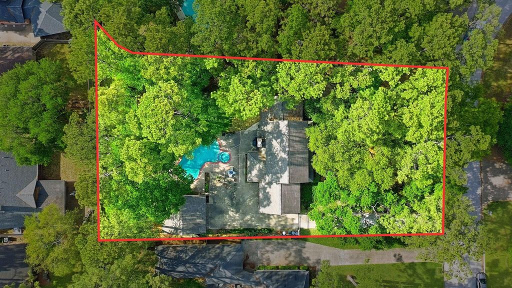 A rare find on over ½ acre! This beautifully wooded property offers exceptional curb appeal with a stunning stone-front porch and private electric gated driveway. Inside, you’ll love the open-concept layout featuring a spacious kitchen with abundant cabinetry, gas cooking, and a large island—perfect for entertaining. The study or formal dining area flows seamlessly into the den with a cozy stone fireplace, and a large game room is conveniently located downstairs. The primary suite includes double sinks and dual closets for added comfort, while upstairs features three well-sized bedrooms. Step outside to your private backyard oasis with a pool, surrounded by mature trees—perfect for relaxing or entertaining year-round. Complete with a detached 2-car garage and located just minutes from the Exxon campus and Klein ISD schools!