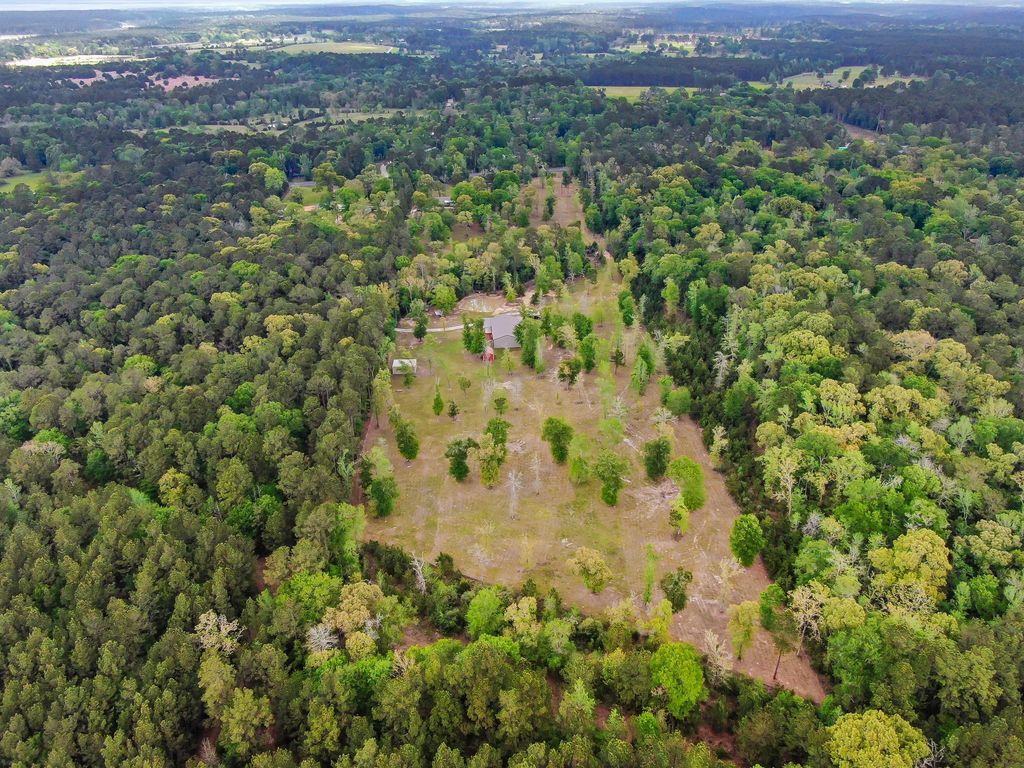 Escape to 13 private acres with room to live, work & roam. Backing directly to the National Forest & protected by an easement on one side, this property delivers a level of privacy & seclusion that’s hard to find—no rear neighbors, wide-open views & space to truly disconnect. Positioned along Hwy 190 with convenient access to Huntsville & Sam Houston State University. Zoned to Huntsville ISD. This rustic barndominium features stained concrete floors, pine ceilings & custom wood trim throughout. The kitchen blends character & function with a vintage O’Keefe & Merritt stove, farmhouse sink, quartz counters & custom vent hood. Flexible 2–3 bedroom layout with a spacious primary suite offering a walk-in shower with bench, dual shower heads & walk-in closet. Combined laundry/pantry adds efficiency. Major systems include HVAC (2020) & water heater (2026). Large shop with 12x10 drive-through doors, cell booster & metal construction. Equipment available for purchase separately.