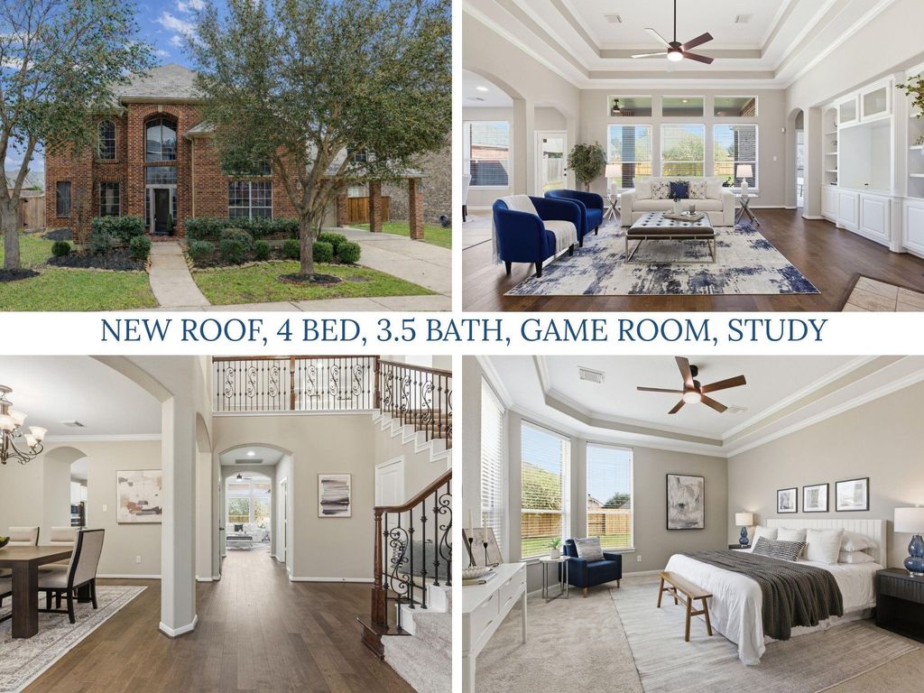 NEW ROOF. This stunning,FULLY RENOVATED two-story home from the original owner is located on a quiet cul-de-sac in Lakes of Bella Terra. Offering four bedrooms, three and a half bathrooms, a private study, and a spacious game room, this home has been thoughtfully updated from top to bottom. Enjoy new engineered wood flooring on the first floor, brand-new upgraded carpet upstairs, and fresh custom interior paint throughout. The kitchen features new stainless steel appliances and opens to a spacious family room with a cozy fireplace. The primary suite with dual vanities, a soaking tub, walk-in shower, and two walk-in closets. Upstairs includes a large game room, three bedrooms, two full baths, and extra attic storage. Outdoor living shines with a covered patio. The home offers a two-car garage plus a two-car porte cochere. Lakes of Bella Terra offers pools, walking trails, lakes, playgrounds, tennis and volleyball courts.Zoned to the new Lamar CISD Tomas High School.Watch 3D walk through