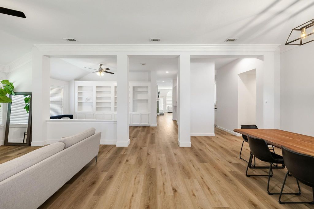 Nestled in a quiet, tree-lined neighborhood with easy highway access, this single-story home offers 3,085 sq ft of flexible living space and a backyard built for everyday enjoyment. The designed layout includes formal living and dining areas, a versatile flex room with built-in shelving, a dedicated home office, and a spacious main living area that flows seamlessly into the kitchen. Updated flooring throughout the main areas adds a fresh, modern feel. The private primary suite features a beautifully remodeled bathroom with sleek finishes and a spacious walk-in shower. Recent updates include new flooring throughout all living spaces, dining room, kitchen, and office, along with new plantation shutters in the living room and office and added recessed lighting in the hallways and kitchen. The private primary suite features a beautifully remodeled bathroom with sleek finishes and a spacious walk-in shower. A fully renovated guest bathroom adds both style. Additional improvements include a newly finished epoxy garage floor and a added office space. Step outside to enjoy the private backyard featuring a sparkling pool and a fully renovated pool and patio area (2022), along with lush landscaping and an enclosed rolling-gated yard. Motivated seller, bring your offers.