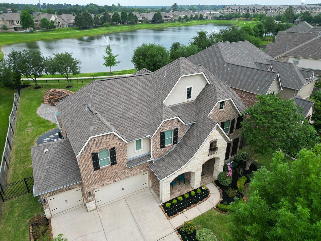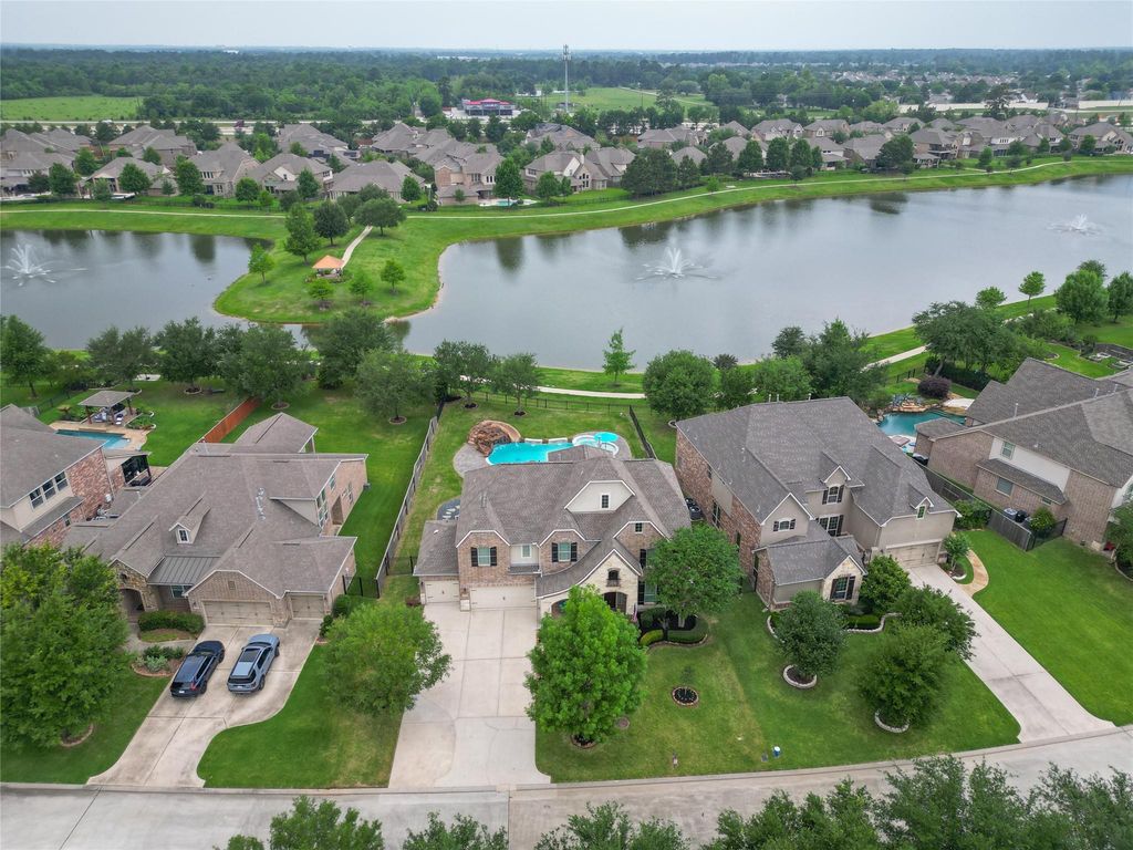 Beautifully maintained 5-bedroom, 4.5-bath home in the gated North Lake section of Gleannloch Farms golf course community. Situated on an oversized lakefront lot with stunning sunset views and fountains. Backyard oasis features a pool with a heater and chiller, grotto, slide and spa. Landscape lighting enhances all trees and highlights the slide, creating a stunning evening setting. Permanent Jelly Lights provide year-round customizable exterior lighting for every holiday. Double high ceilings in the living room. Exceptionally clean and well cared for throughout. Recent updates include new shutters (2023), most windows replaced (2023), new insulated garage doors (August 2022), new garage door motors (July 2025), and a new dishwasher (July 2025). Home includes lightning rods for added safety, water softener system, tankless water heater in the garage and a 30-year roof replaced in 2019. Showings begin April 30, 2026. Drive-by only; please do not disturb seller.