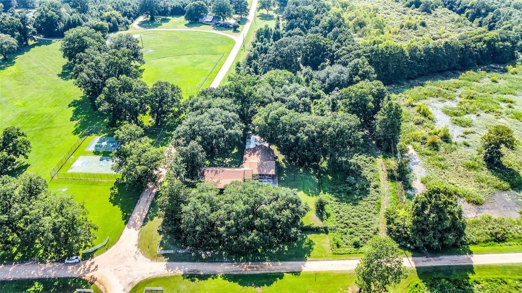 What a deal for size of home and land! 4 excellent acres on scenic, corner lot w/panoramic views of natures beauty, located walking distance to: tennis, park & basketball courts! Home features a spacious 5BR/4BA w/wraparound porches front/back, large workshop w/power, approx. 6+ covered spaces to park or gather all together, LOW TAXES! Improvements by seller New roof , updates to plumbing, & electrical, gutters, new carpet, & remodeled bathrooms. Per seller this is highest lot in the subdivision, Never flooded! Bus stop picks up right at the corner in front of home. Fly in & taxi via the grass runway using the private (XS99) Airstrip located walking distance from home. Stunning oak, pecan trees, & unique fence enclosing aprox 1+ acre, 9 lots on survey total giving great potential and options for new owner! 5 working window units, no farm animals allowed per HOA. Septic recently pumped, in good working order see invoice. See survey, floorplan & video walk-through.