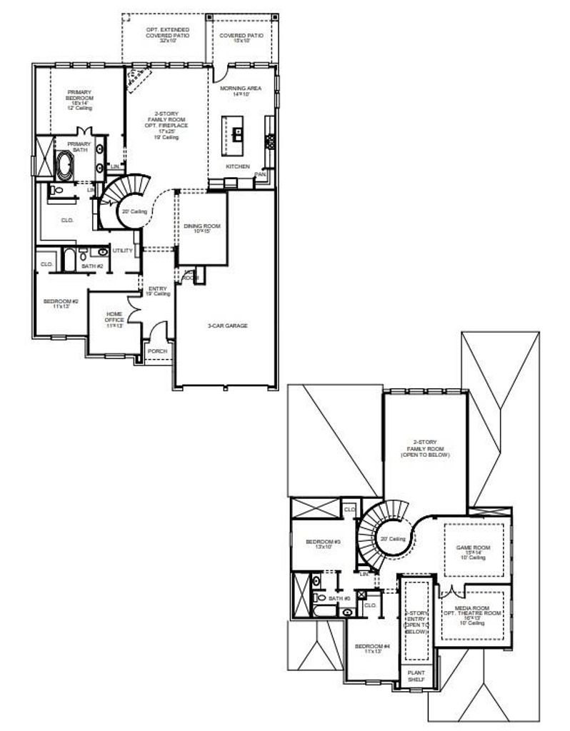 Home office with French doors set at two-story entry. Formal dining room opens to curved staircase. Kitchen and morning area open to two-story family room. Kitchen features generous island with built-in seating space and a 5-burner gas cooktop. Family room features a wood mantel fireplace and wall of windows. Primary bedroom features 12-foot ceiling. Primary bath includes dual vanity, freestanding tub, separate glass-enclosed shower and oversized walk-in closet with access to utility room. A second bedroom is downstairs. A game room, media room and secondary bedrooms are upstairs. Extended covered backyard patio and a 7-zone sprinkler system. Mud room off three-car garage.