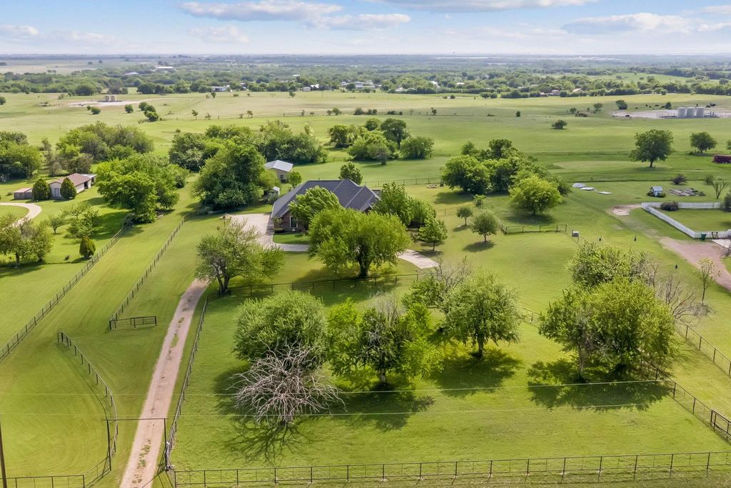 Nestled on over 3 beautifully treed acres in Rhome, this stunning brick home offers the perfect blend of privacy, functionality, and upscale finishes. A welcoming circle driveway sets the tone as you arrive, leading to a thoughtfully designed 4-bedroom, 3-bath layout with all bedrooms conveniently located on the main level and a spacious game room upstairs. Step inside to find stained concrete flooring throughout the main living areas, kitchen, and hallways, creating a seamless and low-maintenance living space. The open-concept living room features a striking stone fireplace and ceiling fan, flowing effortlessly into the well-appointed kitchen. Designed for both everyday living and entertaining, the kitchen boasts a built-in Dacor refrigerator, New Hestan commercial-grade gas range, large island, stone breakfast bar, walk-in pantry, and a charming breakfast area complete with glass-front cabinetry and a Tiffany-style light fixture. A dedicated office at the front of the home includes French doors, built-in desk, and cabinetry—ideal for working from home. The spacious primary suite offers a relaxing sitting area and a luxurious ensuite bath with separate vanities, garden tub, and an oversized walk-in closet with built-ins. Secondary bedrooms are thoughtfully split for added privacy. All bathrooms feature distinctive copper sinks, adding a custom touch throughout. Outdoors, enjoy a true entertainer’s retreat with a covered living area featuring a built-in grill, stone fireplace, refrigerator, and breakfast bar. The property also includes two separate workshops, providing ample space for hobbies, storage, or business use. This unique property combines peaceful country living with high-end amenities—don’t miss the opportunity to make it yours!