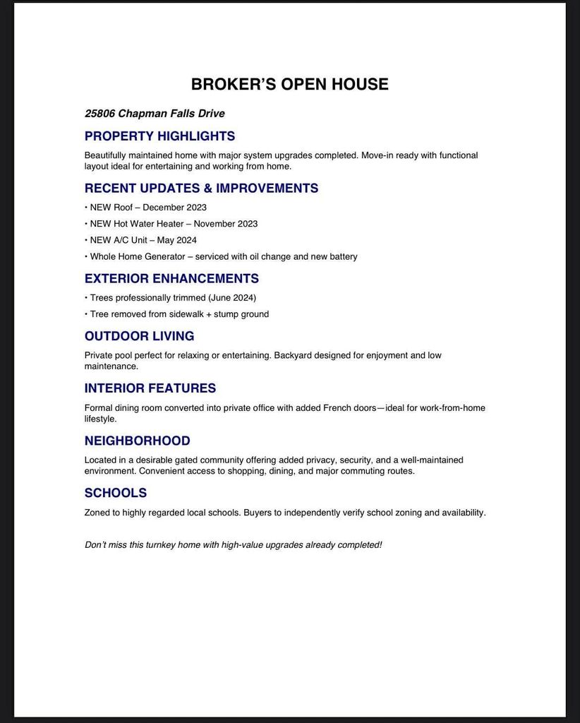 25806 Chapman Falls Dr is listed for sale at $ 399,900. The Single-Family property has 4 bedrooms, 3 Full Bathrooms, 1 Half Bathroom, 2871 square feet and was built in 2005. The lot size is 6349 Square feet. ##BR##Welcome to this beautifully updated, move-in ready home in the gated community of Westheimer Lakes! From the grand foyer with soaring ceilings to the open, light-filled layout, every detail has been thoughtfully upgraded. Enjoy quartz countertops, refreshed cabinetry, updated lighting, tile and laminate flooring, and new carpet upstairs. The spacious living area overlooks your private backyard retreat featuring a sparkling pool, patio, and pergola—perfect for relaxing or entertaining. The primary suite offers a peaceful escape with modern finishes and pool views. A whole-house generator provides year-round reliability. With no direct backyard neighbors and close proximity to shopping, dining, and major highways, this home truly has it all! Welcome to the master planned community of Westheimer Lakes and all of its amenities. Low 2.2 tax rate. SHORT SALE - SUBJECT TO LENDER APPROVAL