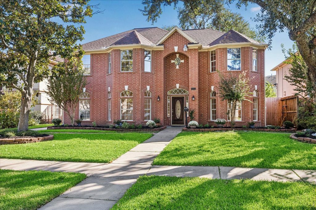 Stately Georgian-style brick home in highly sought-after Bellaire, built in 1999. This elegant two-story home offers a formal dining room with arched windows and crown molding, spacious living room with a fireplace overlooking the backyard, and a bright kitchen with white cabinetry and breakfast room. The primary suite is located downstairs with an en-suite bathroom featuring dual vanities, jetted tub, and separate shower. Upstairs includes four large bedrooms, a generous game room, and abundant storage. Outside, enjoy a spacious landscaped backyard with mature trees, patio, room for a pool and a detached two-car garage with a garage apartment above—ideal for guests, home office or additional living space. Classic architecture, spacious living spaces, and a prime location make this home a rare find in one of Houston’s desirable neighborhoods. Convenient access to parks, Bellaire schools, shopping, and dining completes the appeal of this residence!
