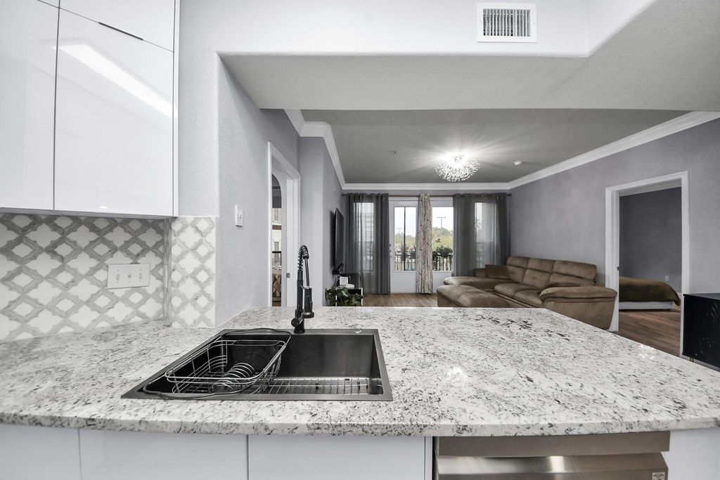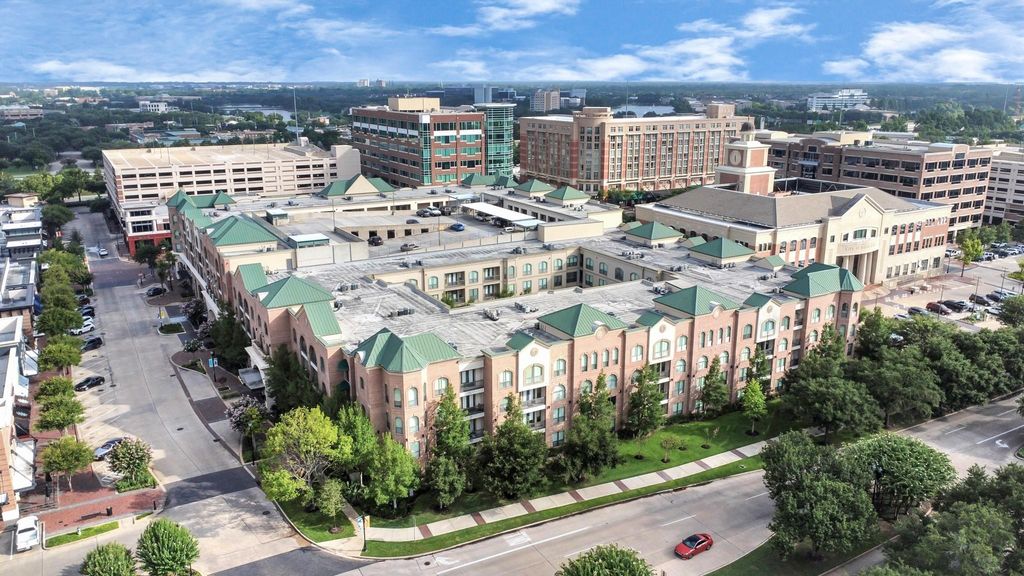 Stunning luxury condo in the heart of Sugar Land Town Square! This beautifully updated 2-bedroom, 2-bath residence offers a bright open-concept layout with modern finishes throughout. The gourmet kitchen features sleek high-gloss cabinetry, granite countertops, designer backsplash, stainless steel appliances, and a spacious breakfast bar that flows seamlessly into the living area—perfect for entertaining. Large windows bring in abundant natural light with a door opening to your private patio overlooking lush surroundings, perfect for your favorite plants. The primary suite includes an elegant bathroom and generous closet space. The second bedroom offers its own beautifully updated en suite bath and a large walk-in closet, making it perfect for guests or extended stays. Enjoy luxury living with resort-style amenities, secure access, and unbeatable walkability to premier dining, shopping, entertainment, and events right in Town Square.