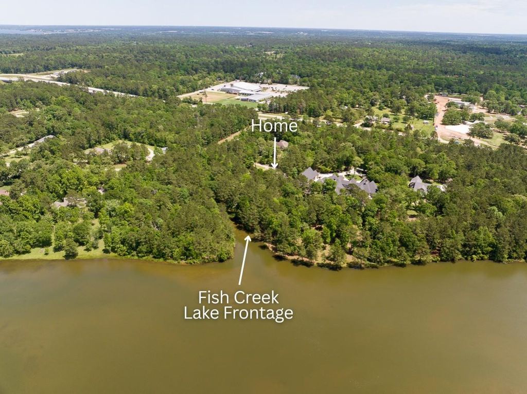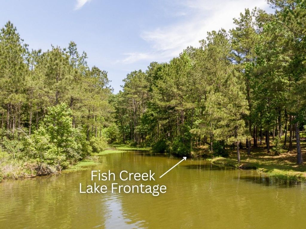 Lake Frontage! Rare and unique opportunity to purchase a home on 1.7 acres with frontage on Fish Creek Lake. Custom built and cared for, this home has excellent potential to make your own. Spacious primary suite, 3 guest bedrooms, an office, wet bar, and bonus loft space! The primary suite features a soaking tub, roomy shower, and his and hers vanities along with spacious closets. The bonus loft has hidden access making it a great, flexible space for a movie room, safe room, or whatever your heart desires. Custom details include wooden trusses, brick fireplace, and a tucked away dog room. The lot is nicely wooded, hiding the home from view of the road. Behind the home, the land has been kept mostly natural while still allowing views of the lake. Excellent potential for animals, kids, the hobby fisherman, or those desiring water access and a view!