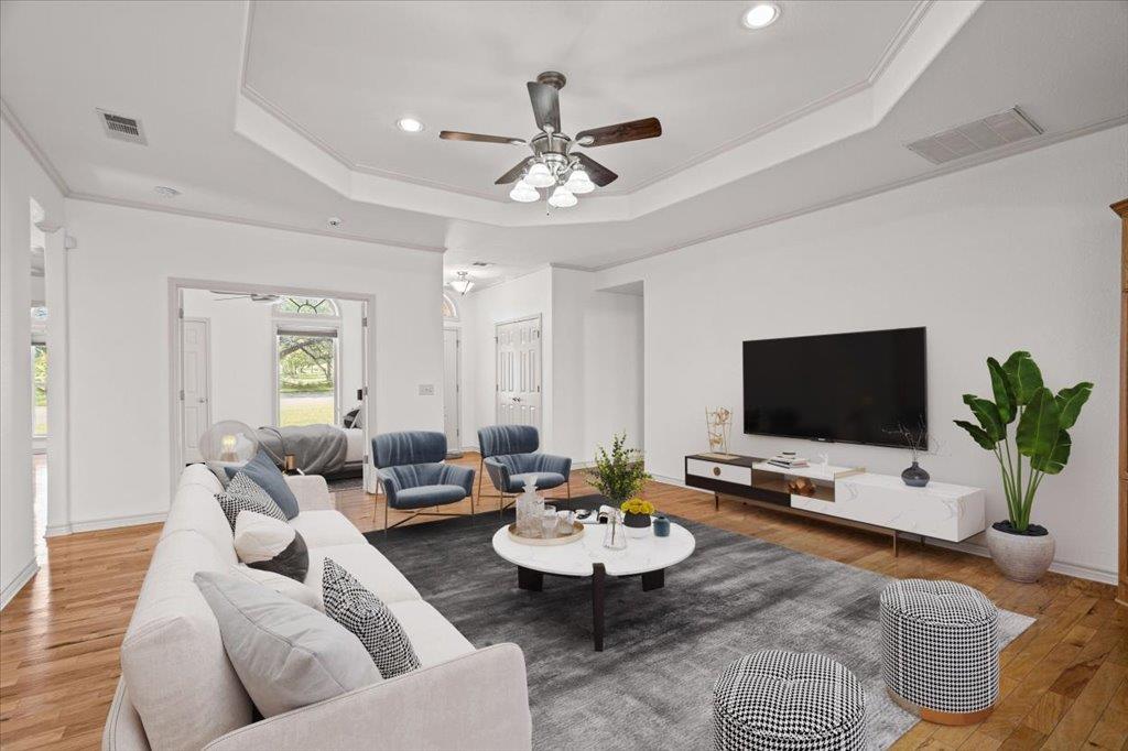 Bookcases, Ceiling Fan(s), Ceiling-High, Ceiling-Tray, Counter-Granite, Crown Molding, Double Vanity, Electric Dryer Hookup, Eat-in Kitchen, French Doors, Kitchen Island, No Interior Steps, Open Floorplan, Pantry, Primary Bedroom on Main, Recessed Lighting, Soaking Tub, Two Primary Closets, Walk-In Closet(s), Washer Hookup