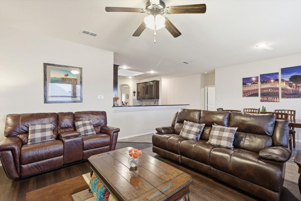 This well-maintained 3 bedroom, 2 bathroom home on a quiet cul-de-sac offers over 2,100 square feet of thoughtfully designed living space, conveniently located off I-35W near Alliance Town Center, Texas Motor Speedway, Tanger Outlets Fort Worth, and downtown Fort Worth. Pride of ownership is evident from the moment you arrive, with inviting curb appeal and a welcoming covered entryway. Inside, you will find a designated office with French doors which can also be used as a bedroom, along with a separate living area that can serve as a formal dining room or flexible living space. The heart of the home features an open-concept layout connecting the living room, kitchen, and breakfast area, perfect for everyday living and entertaining. The living room showcases wood floors and a cozy gas fireplace, while the kitchen offers granite countertops, stainless steel appliances, and an eat-in breakfast area overlooking the backyard. The primary suite includes an ensuite bathroom with a separate shower, deep soaking tub, double vanity, and a walk-in closet. Two secondary bedrooms are split from the primary suite and share a full bathroom. Step outside to enjoy an oversized covered patio and a spacious backyard ideal for relaxing or entertaining. Located in the desirable Tehama Ridge neighborhood, residents enjoy premium amenities including a community pool, park, and fishing pond.