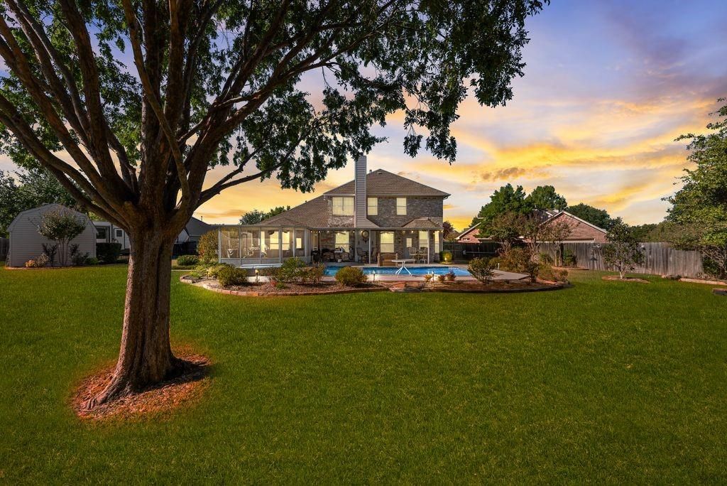 Nestled on a spacious cul-de-sac lot in an established neighborhood, this well-maintained & thoughtfully cared-for 4-bdrm, 2.5-bath home offers the perfect blend of comfort, functionality, & exceptional outdoor fun. The kitchen was beautifully remodeled in 2016 & features custom, site-built cabinetry, granite countertops, & updated appliances. An adjacent breakfast area provides space for everyday meals, while the formal dining room is ideal for hosting gatherings and holiday celebrations. A dedicated office with a built-in desk & custom cabinetry offers an ideal work-from-home setup with abundant storage. The inviting living area is anchored by a charming fireplace, creating a warm focal point for both entertaining & relaxing evenings. Outside is a private backyard retreat, complete with a sparkling pool, perfect for cooling off during summers or hosting friends & family. Beyond the pool, a generously landscaped yard provides ample space for play, pets, or outdoor activities. The screened-in sunroom offers a versatile, year-round space to relax or dine while enjoying views of the backyard, all protected from the elements. The projector & screen convey, making it an ideal bonus space with direct access to the primary suite. The primary suite has a walk-in closet which features a custom closet system. Enhancing the property’s versatility is an outbuilding, shed wired for electricity, ideal for a workshop, hobby space, or additional storage. An adjacent extra parking pad offers convenient space for vehicles, trailers, or recreational equipment (not visible above the fence line). A 50-amp plug adds even more functionality & perfect for electric vehicle charging or powering specialized equipment. In addition, the garage is outfitted with custom storage cabinets & as well as some overhead storage. Situated on an approximately 0.38-acre lot, this property offers a rare combination of privacy, usable space, & flexibility, a standout opportunity in today’s market