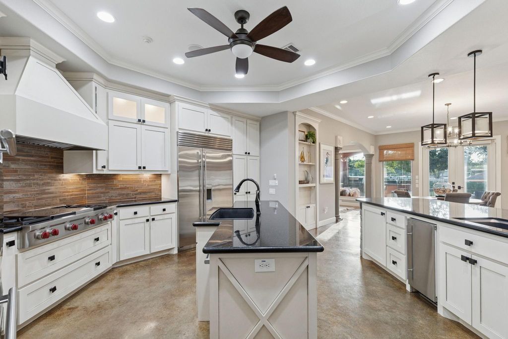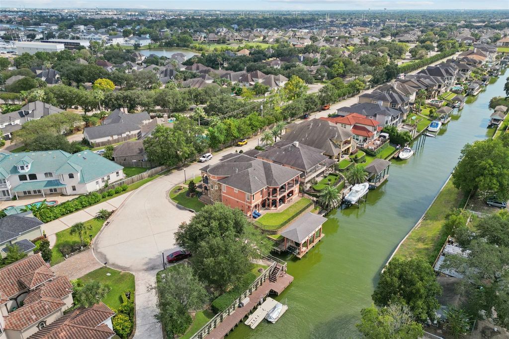 Welcome to 107 Blue Water Way, where timeless Mediterranean design meets waterfront luxury in the exclusive, gated community of Marina Del Sol. Perfectly situated on a corner lot next to the community boat ramp, this boater’s paradise includes a private boat slip with lift, full outdoor kitchen and full bathroom outside. The property offers 5 bedrooms, 5.5 baths, living room with high ceilings and fireplace with stacked stone and exceptional features including 3 hidden rooms, elevator, 2 utility rooms, and spacious game and media rooms. The kitchen includes Wolf appliances, Sub-Zero refrigerator, 2 dishwashers, pot filler, quartz countertops, and oversized island. Entertaining is effortless with multiple terraces, a wet bar, wired sound, and expansive water views. Added peace of mind comes with 2 Generac generators and spray-foam insulation. Minutes from Kemah Boardwalk, NASA, and Galveston Bay, this estate combines elegance, comfort, and the ultimate waterfront lifestyle. Call today