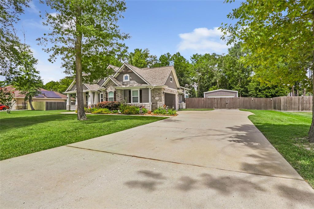 Stunning custom home that shows like a model home inside and out! Meticulously maintained home on 1 acre PLUS at 1500 SF workshop! The wow factor starts with the front porch - you will enjoy decorating for all the holidays! Whether you work from home full time or just manage the family you will love this home office! Open family room with custom built ins, wood burning stone fireplace. Chef's dream kitchen features island for storage and prep, granite counters, under mount lights, cooktop with pot filler, stainless appliances and walk in pantry. Dining room with lots of windows and back yard view; owner's retreat located in rear of home features HUGE spa-like bath with separate sinks/vanity area, soaking tub, shower and amazing walk in closet with direct access to the utility room; utility room has sink and lots of storage; secondary beds and bath on opposite side; 20x30 workshop is 10' tall with electrical and roof insulation; water softener; new roof; tile flooring through main areas