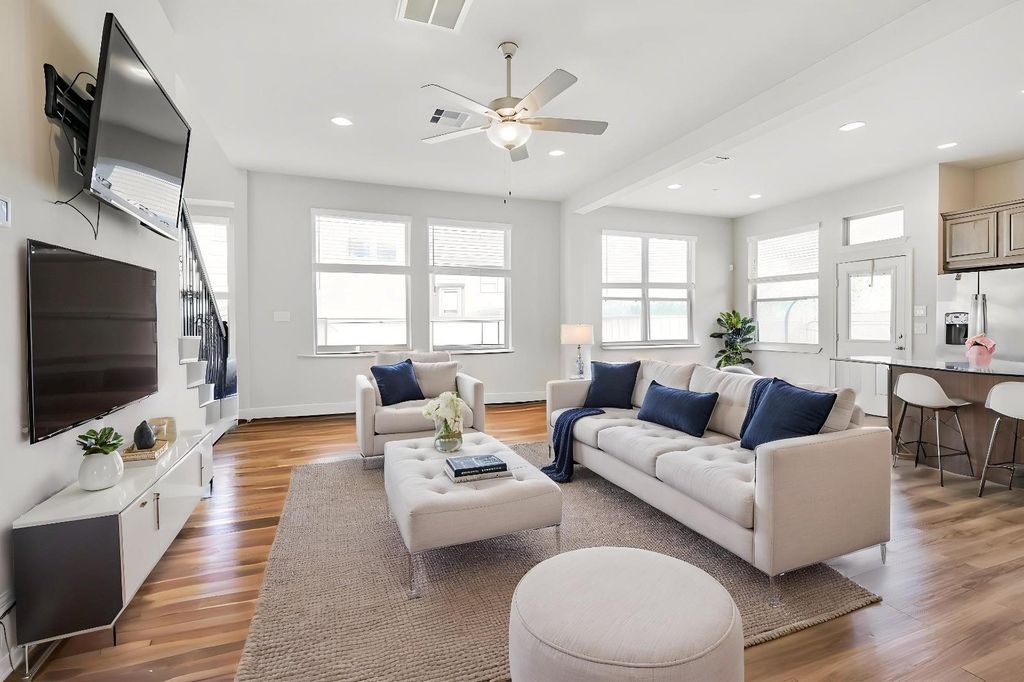 Beautiful 3 bed, 2.5 bath townhome on a rare pie-shaped lot in highly sought-after Bridgeland. Open-concept living with rich cabinetry, gas range, island with seating, pantry, and seamless flow to the living area. Bright breakfast nook overlooks an oversized backyard. Upstairs features a flex space and split bedroom layout for privacy. Spacious primary suite with garden tub, separate shower, dual vanity, and walk-in closet. Enjoy resort-style amenities, lakes, trails, parks, pools, and nearby new H-E-B, shopping, and dining.