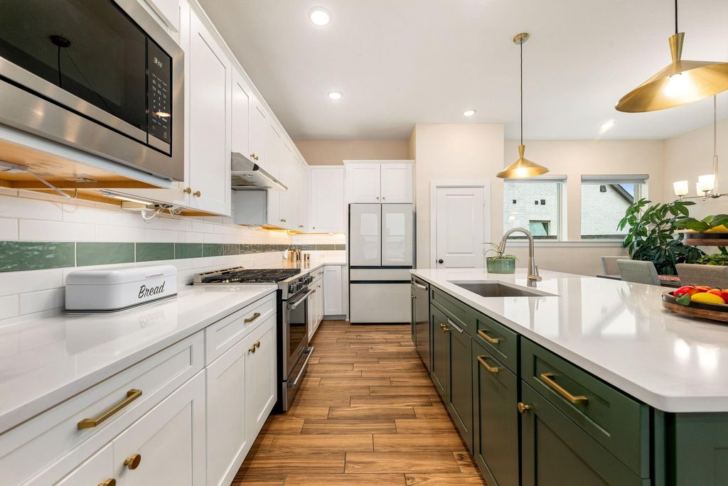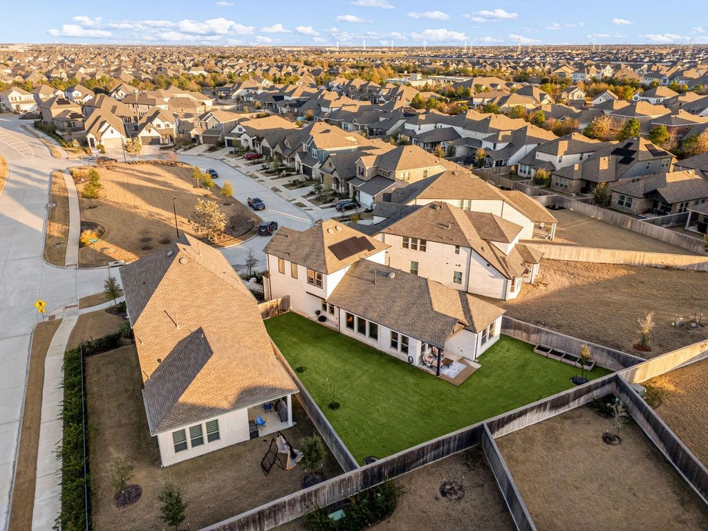 Welcome to 19747 County Starr Circle in the highly sought-after Bridgeland community of Cypress, built in 2022 with modern design and refined finishes throughout. This 3-bedroom, 2.5-bath home offers an open-concept layout centered around a chef-inspired kitchen featuring an expansive quartz island, custom cabinetry, stainless steel appliances, and designer lighting flowing into bright living and dining areas. The private primary suite is tucked away at the rear of the home for added privacy, while the vaulted ceiling in the breakfast area fills the space with natural light. Enjoy outdoor living on the covered patio overlooking the fully fenced backyard, plus a side patio ideal for entertaining. Solar panels are fully paid off and transfer to the new owners for added energy efficiency and savings. Bridgeland offers top-rated schools, miles of trails, parks, resort-style amenities, and convenient access to major roadways.