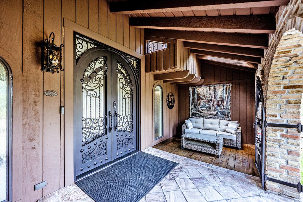 This exceptional 4-bedroom, 3-bath, 4,000 sq ft residence showcases distinctive Spanish-inspired architecture with truly one-of-a-kind design throughout. A grand 9-foot wrought iron entry door opens to a beautiful arched windows entry, leading into an impressive living room featuring 12-foot beam ceilings & a striking floor-to-ceiling brick fireplace.The open-concept layout seamlessly connects the living, dining, & kitchen areas, anchored by a wraparound bar ideal for entertaining. A thoughtfully designed theater room, complete with a dry bar & snack bar, offers an elevated entertainment experience. Two bedrooms are situated on one side of the courtyard, while a separate ground-level en suite bedroom provides added privacy, ideal for guests/home office. The expansive primary suite occupies its own level & features a spa-like bath with tranquil, nature-filled views. Outdoor living is equally inviting, with an oversized covered patio, a 6-foot fountain, & a peaceful, private setting.