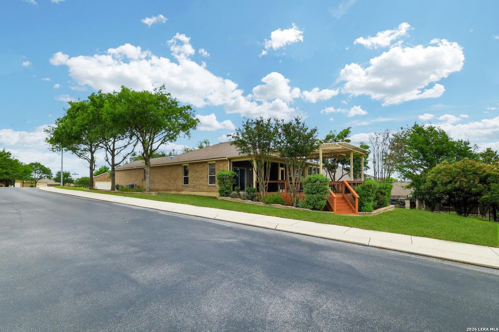 Welcome to 4202 Black Rock in San Antonio's premier 55+ community, Hill Country Retreat, where thoughtful upgrades and resort-style living come together beautifully. This beautifully maintained 2-bedroom, 2-bath home with a private study offers a spacious open-concept layout designed for both everyday comfort and effortless entertaining. The heart of the home is the well-appointed kitchen featuring Corian countertops, stainless steel appliances, a large island with ample storage, and cabinet pullouts throughout for ease of access. What truly sets this home apart is the extensive list of recent improvements and high-value upgrades. Enjoy luxury vinyl plank flooring throughout the main living areas, bedrooms, and flex space, along with crown molding and upgraded baseboards that add a refined finish. Step outside to an exceptional outdoor living space featuring a massive 19x19 Ipe wood deck and an upgraded pergola with adjustable louvers, offering the perfect blend of shade and s