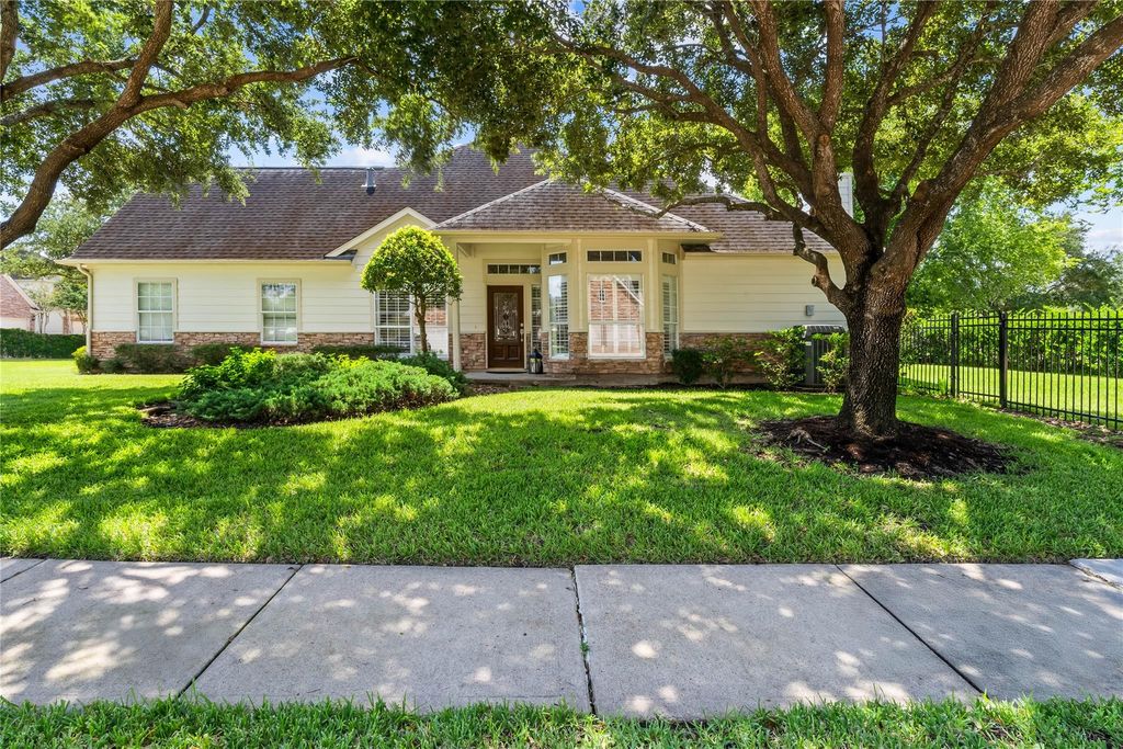 RARE! 1-STORY Low Maintenance Townhome in Greatwood! This charming 3-bedroom, 2-bathroom corner-lot home is just minutes from 59. With a stone exterior and manicured landscaping, this property offers timeless curb appeal in a sought-after golf course community. Step inside to a welcoming entryway with tile floors, chandelier, and custom paint and PLANTATION SHUTTERS. The spacious living room features built-in shelving, stone gas log fireplace as its centerpiece, while large windows fill the space with natural light. The open layout flows seamlessly into the dining area and kitchen, complete with 42" modern white cabinetry, tile flooring, and breakfast bar. The primary suite is a relaxing retreat with an en-suite bath featuring double sinks, jetted tub, and separate shower. Secondary bedrooms provide flexibility for guests or office use. Outside, enjoy a fenced backyard, side yard, and access to community pools, tennis, trails, and top-rated Lamar CISD schools.