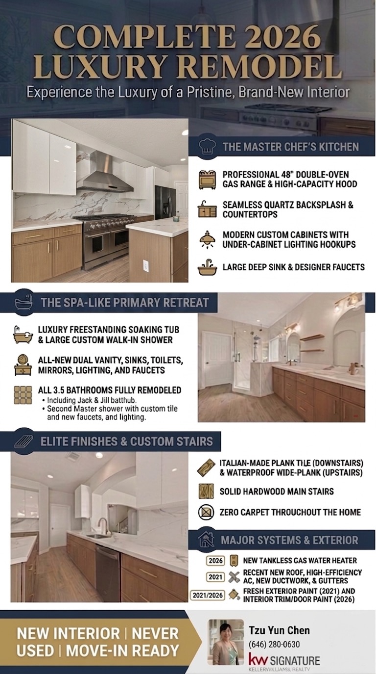 COMPLETE 2026 LUXURY REMODEL | MOVE-IN READY Experience the feel of a brand-new home in an established community. Fully reimagined in 2026, this residence blends modern design, high-end finishes, and everyday functionality. The chef-inspired kitchen has been completely redesigned with a 48” double-oven gas range, high-capacity hood, quartz countertops, full-height backsplash, and custom cabinetry with pull-out storage. All 3.5 bathrooms are fully remodeled with updated finishes, including a luxurious primary suite featuring a freestanding soaking tub and oversized walk-in shower. Interior upgrades include Italian wood-look porcelain tile downstairs and waterproof wide-plank flooring upstairs for a clean, modern look. Major system updates (2021) include roof, HVAC, ductwork, gutters, and garage door, plus a 2026 tankless water heater for long-term comfort. Designed for real living, this turnkey home offers a complete, high-quality transformation throughout.