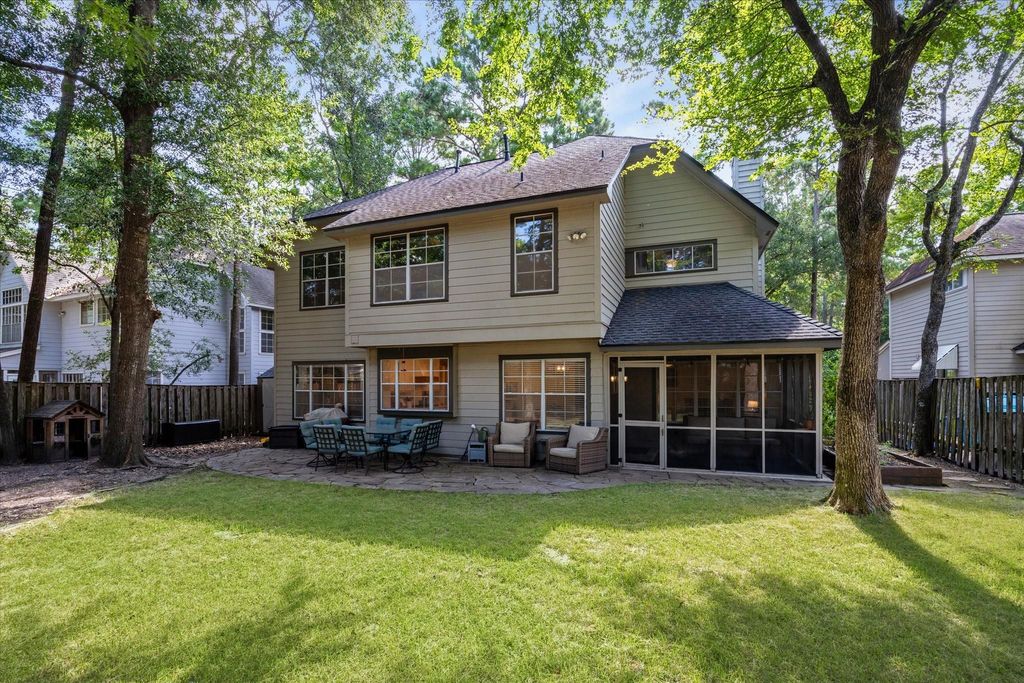 Welcome to Greywing, a beautifully updated 5-bedroom, 2.5-bathroom home located in the heart of The Woodlands. Nestled among towering trees, this spacious two-story features soaring ceilings, abundant natural light, and an open-concept layout perfect for entertaining. The primary suite offers privacy and luxury, while the upstairs includes four additional bedrooms. Downstairs has a dedicated office with French doors provides a quiet space to work from home. The modern kitchen boasts Quartz countertops, ample cabinetry, and stainless steel appliances. Enjoy peaceful outdoor living with a covered screened patio and a wooded backyard. Zoned to top-rated Conroe ISD schools and minutes from parks, shopping, dining, and trails, this home combines comfort, style, and convenience. Don’t miss your chance to live in one of The Woodlands’ most desirable neighborhoods!