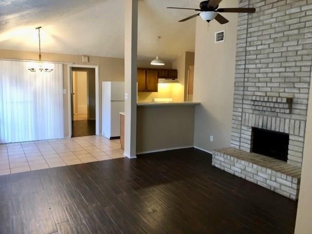 Cute 2/2 duplex with High Ceilings, Fireplace, Great Open Floor perfect for entertaining. Fresh paint inside, tile & blinds throughout. Kitchen comes with all appliances. Walk-in closets, Double Sinks in Primary Bath, Inside Utility Room. Fully Fenced Backyard and own side parking spaces. Close to major highways and airport. $25 trash fee will be added to monthly rent.