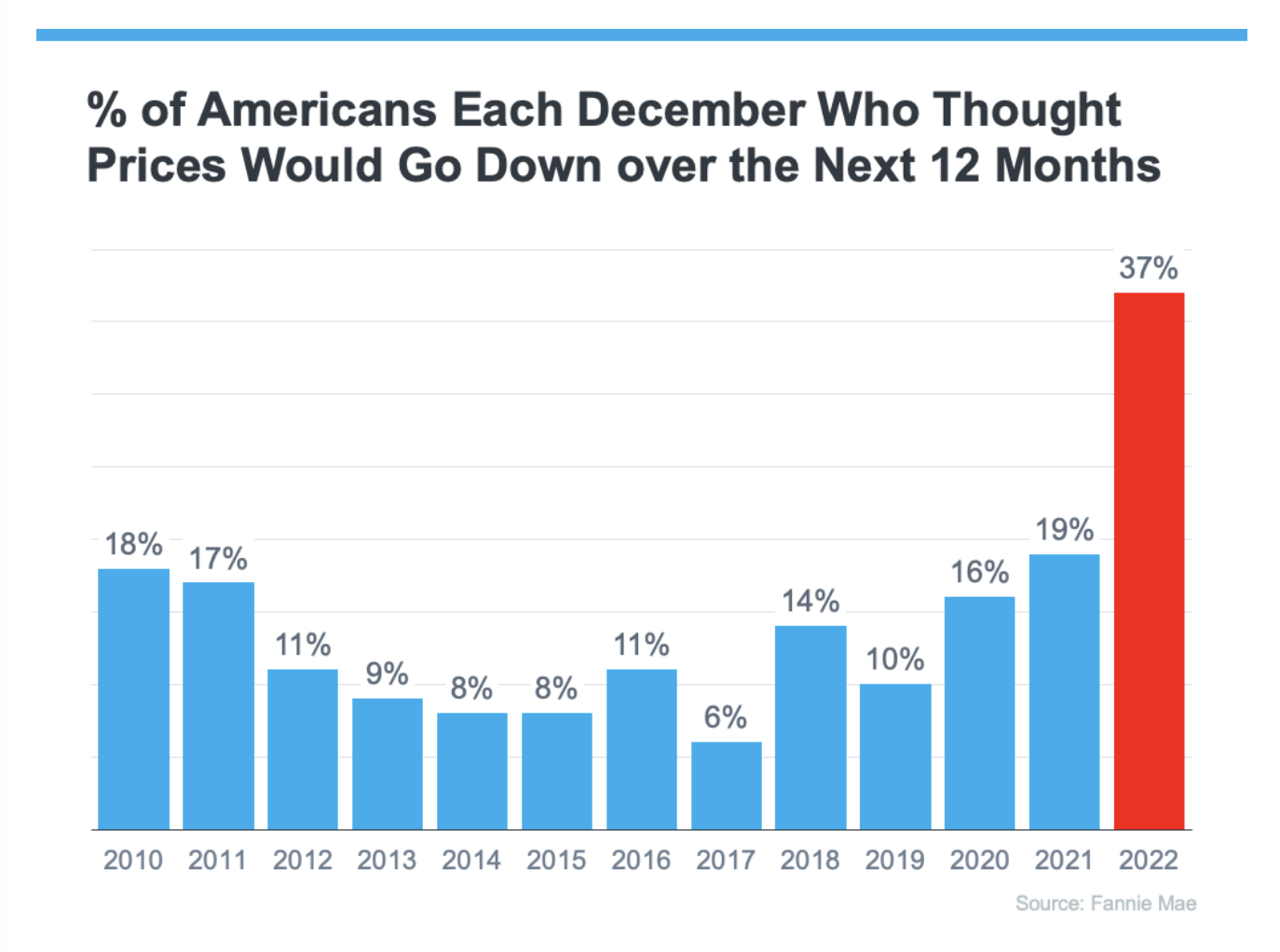 These forecasts put doubt in the minds of many consumers about the strength of the residential real estate market. Evidence of this can be seen in the December Consumer Confidence Survey from Fannie Mae. It showed a larger percentage of Americans believed home prices would fall over the next 12 months than in any other December in the history of the survey (see graph below). That caused people to hesitate about their homebuying or selling plans as we entered the new year.