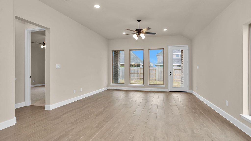 READY FOR MOVE-IN! Coffered extended entry leads past game room to open kitchen, dining area and family room. Kitchen features deep walk-in pantry, 5-burner gas cooktop and generous island with built-in seating space. Dining area features curved wall of windows. Family room features wall of windows. Primary suite includes bedroom with wall of windows. Double doors lead to primary bath with dual vanity, garden tub, separate glass-enclosed shower and oversized walk-in closet. Abundant closet space and large windows add to this spacious four-bedroom design. Extended covered backyard patio and 6-zone sprinkler system. Mud room off two-car garage.