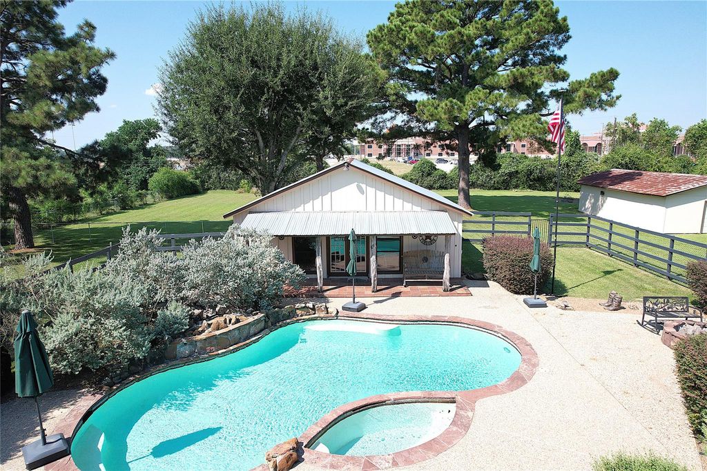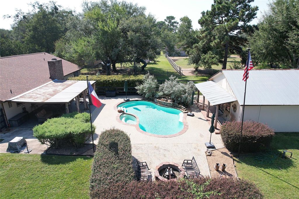 Attractive Ranch Style Home with saloon, pool, and barn nestled in the Cypress Hill Subdivision. Single story - 3 bedrooms and 2 full baths. Additional flexroom with much closet and cabinet space, can be used as an extra bedroom, mediaroom, or crafting space. Primary bedroom has 2 walk-in closets, a free standing shower, and his/her vanities. Kitchen features granite countertops, a double oven, updated dishwasher, and refrigerator. Large open dining space includes windows that allow a complete view of the porch, pool, and saloon. Vaulted ceiling and brick fireplace in living room. Utility room includes a washer, dryer, and upright freezer. Tiled main floor areas. New carpet in bedrooms. Rustic Backyard Appeal - large covered patio with BBQ pit, furniture, and fans. Pool (including rock waterfall), hot tub, and firepit. Saloon with wet bar and half bath - pool house, mother in law quarters, or whatever you wish.