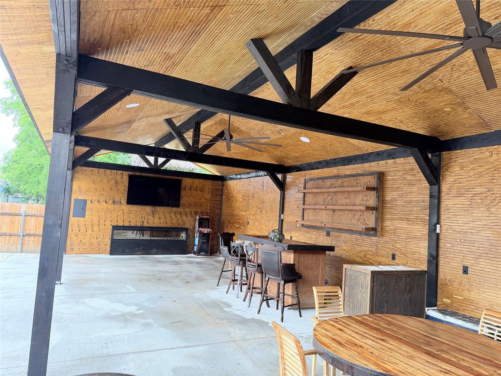 Beautiful 3 bedroom, 2 full beautifully up-grade bathrooms, 12ft celling and 8ft custom doors, with a quartz kitchen counter tops, open living and kitchen, Master Bedroom with 12ft ceiling with cedarwood cross beams, hose also includes a spacious backyard with concrete patio, GFCI outlets installed on exterior. The outdoor living space is a true showstopper. Enjoy a spacious backyard with a durable concrete slab and a premium covered patio designed for year-round entertaining. This outdoor oasis features a sleek electric fireplace, a built-in grill station with a stone base, a bar area with custom wooden shelving, TV mounts (TV not included) , and ample GFCI outlets for convenience.
