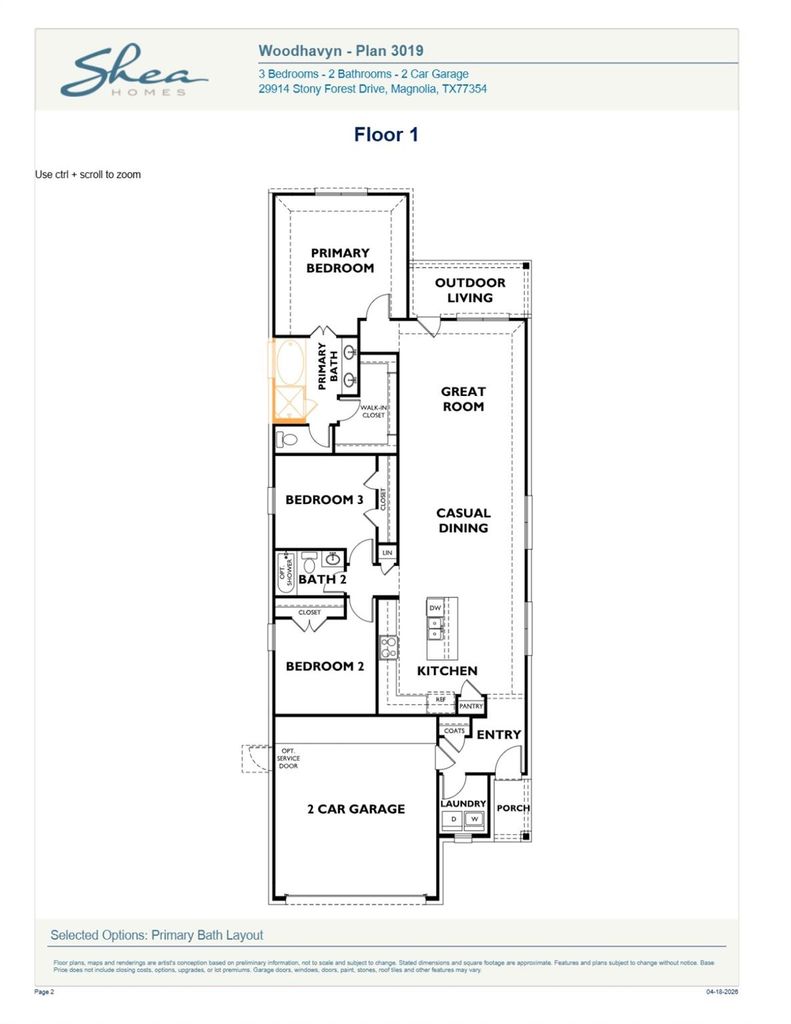 Completion date of September 2026! Welcome to Woodhavyn and our 3019 plan! You will be nestled in a wooded community on a quiet cul-de-sac in Magnolia. This home features 3 bedrooms and 2 baths. The kitchen is made for a chef with a gas built-in cooktop and a large island. 42" cabinets are a plus in this cozy home. Keyless entry and a ring doorbell are included. Woodhavyn will open its amenities in October of 2026, with a large resort pool, playground, clubhouse, and a splash pad available to all residents. We will also feature Woofhavyn our dog park! Come see us today!