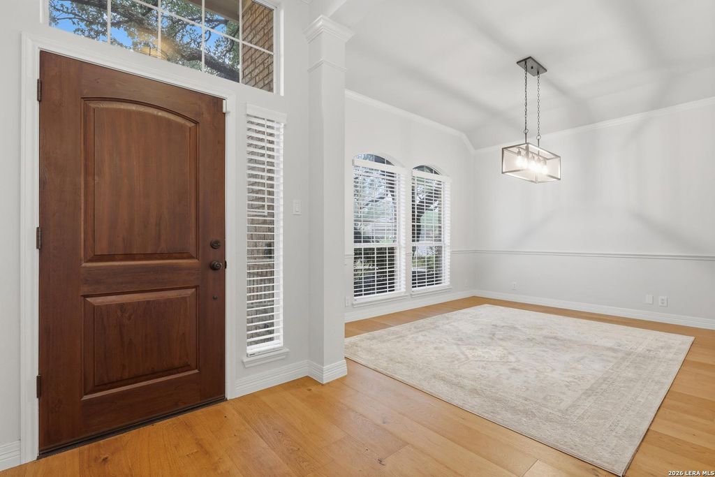 Welcome to this beautifully upgraded single-story David Weekley home located in one of Stone oak's most desirable, established neighborhoods. This light-filled residence features high ceilings and wood flooring throughout. The bright, inviting dining room offers large windows and elegant lighting, making it ideal for entertaining. The open-concept kitchen and living area create a comfortable, connected space with granite countertops, stainless steel appliances, a center island, and a cozy fireplace as the focal point of the living room. The spacious primary suite provides a relaxing retreat with dual vanities, a soaking tub, a separate shower, and a large walk-in closet with abundant storage. Step outside to enjoy the raised deck and a manageable outdoor space designed for low-maintenance living-perfect for morning coffee or evening unwinding. Conveniently located near shopping, dining, and top-rated schools in highly sought-after Stone Oak area.