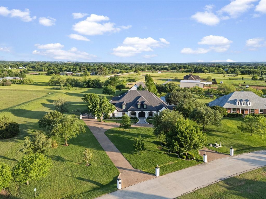 1.59 Acres - Guest House - 2 Story Workshop - Sparkling, Heated Pool - Koi Pond! A Private Sanctuary just north of Fort Worth. Located in award-winning Aurora Vista, this masterfully redesigned estate delivers an exceptional blend of luxury, versatility, and resort-style living on a sprawling lot, adjacent to protected greenspace that will not be developed. From the moment you arrive, curated design, expansive spaces, and elevated finishes set the tone for a home unlike any other. The thoughtfully designed interior offers 3 downstairs bedrooms and 3 baths, with an additional bedroom, full bath and bonus room on the second floor. Natural light, refined materials, and intentional spaces create a seamless balance of sophistication and comfort. At the heart of the home, the chef’s kitchen is a true showpiece, featuring double quartzite waterfall islands that combine striking design with everyday functionality. Indoor & outdoor living converge effortlessly, offering inviting spaces for both entertaining and quiet retreat. The grounds provide a tranquil escape, highlighted by a serene koi pond, double gas fire pits and spa. A detached guest house adds flexibility for guests, multigenerational living, or a private office. The impressive two-story, climate-controlled workshop—complete with electric and pneumatic systems—delivers exceptional versatility for hobbies, business, or storage. Additional upgrades include a whole-home water filtration system, generator, and a private water well dedicated to irrigation—enhancing efficiency and sustainability. The property is further enhanced by professional landscaping, striking exterior up-lighting, and outdoor natural gas fire pits and spa that create an inviting ambiance for evening gatherings. The fully equipped shop features 14-foot pass-through doors for maximum accessibility. A rare opportunity to own a distinctive North Texas acreage property offering space, versatility, and refined living. New Roof Apr