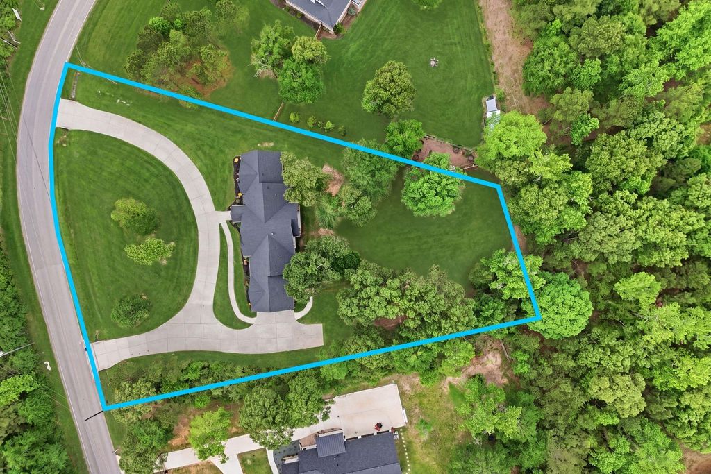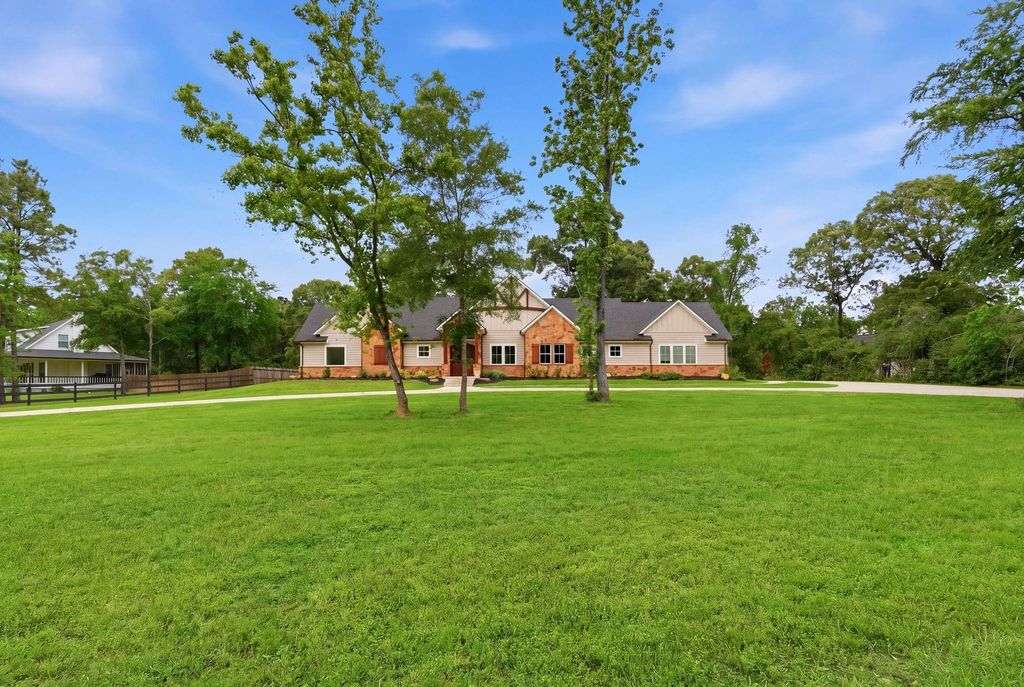 Welcome to your custom one story sanctuary situated on over an acre of Montgomery land. This striking home features eye catching curb appeal, a welcoming portico entry, and soaring cathedral ceilings in the family room. Wooden accent beams, open concept design, and eight foot doors throughout create an airy, sophisticated feel. Huge glass windows frame the covered patio overlooking a peaceful, expansive yard with endless possibilities for a pool, workshop, or entertainer's paradise. Daily visits from deer as well. The primary suite is stunning. Premium upgrades include a tankless on demand water heater, spray foam insulation, beautiful granite countertops, and generator hookup. An expansive driveway directly connects to the garage and also circles the front for easy guest access/exit. Perfect for those seeking space, style, and room to entertain. The possibilities are endless!