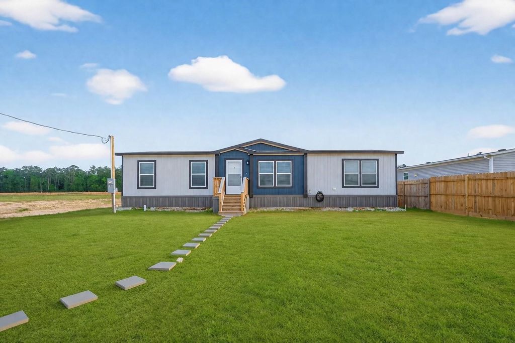 Beautiful 2024 modular home offering 1,568 SF of living space on a spacious 14,000 SF lot. This open-concept design features modern finishes throughout. The kitchen is equipped with stainless steel appliances, ample cabinetry, and a center island that opens to the living and dining areas, perfect for entertaining. The spacious primary suite includes a double vanity and a separate combo tub and shower with an extra-large soaking tub. Three additional bedrooms provide flexibility for family, guests, or a home office. With no HOA, a low tax rate, and located outside the flood zone, this property offers both comfort and freedom.