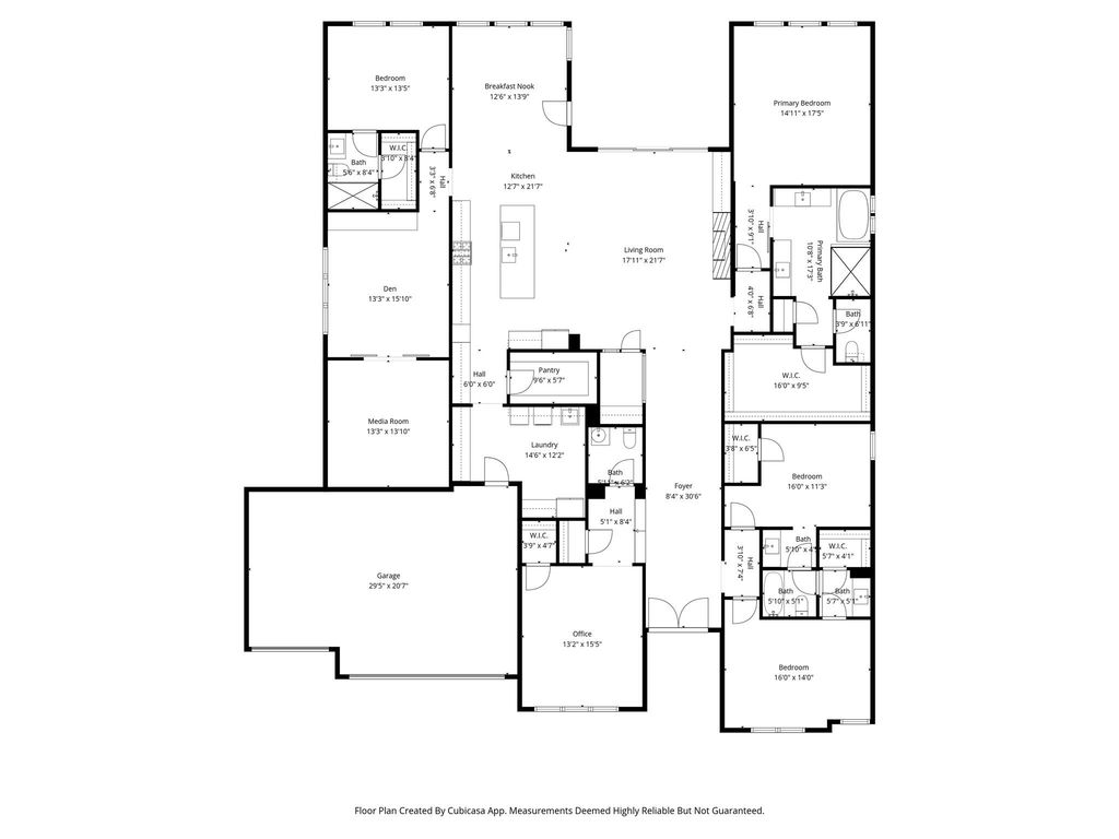 Follow the hall into the heart of the home and prepare to stop in your tracks. The living room features a floor-to-ceiling black granite fireplace, custom built-ins, and a glass-enclosed marble wine bar that belongs in a magazine. Sliding glass doors make for great entertaining and blend the line between inside and out. The kitchen keeps pace w- quartz countertops, double ovens, dome pendants, a butler's pantry w- open shelving, and a sun-drenched breakfast room with backyard views. The primary suite is your private retreat: standalone tub, oversized shower, dual vanities, walk-in closet, and motorized shades. On the opposite wing is the 4th bedroom w-ensuite bath, den w-built ins, and barn doors that open to a dedicated media room w-charcoal walls, projector, and surround sound.