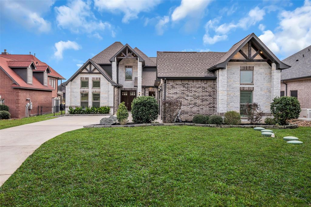 Magnificent waterfront 4 bed/4 bath home boasts stunning backyard views, floor to ceiling Austin stone fireplace & cedar ceiling beams. Open great room/ dining/ kitchen w/coffee bar, beverage cooler plus custom bar/wine room w/wine cooler make for entertainer's delight. Kitchen is chef's kiss offering luxury appliances including double oven & Jennair range/vent hood & walk-in pantry. Designated study boasts paneling & large closet. Primary suite w/walk-in closet, large tile shower, tons of counter/cabinet space & oversized linen closet. Two downstairs guest rooms share Jack & Jill bath. First floor also features full guest bath, flex space makes perfect gym or studio. 3car garage w/epoxy flooring & tons of storage. Upstairs offers huge game room, bedroom & full bath. Walk out to backyard paradise complete w/luxury outdoor kitchen, resort style pool w/gorgeous stone waterfalls, walkway down to boat dock/lift & easy access to open water. All this & much, much more! Don't Miss This One!!