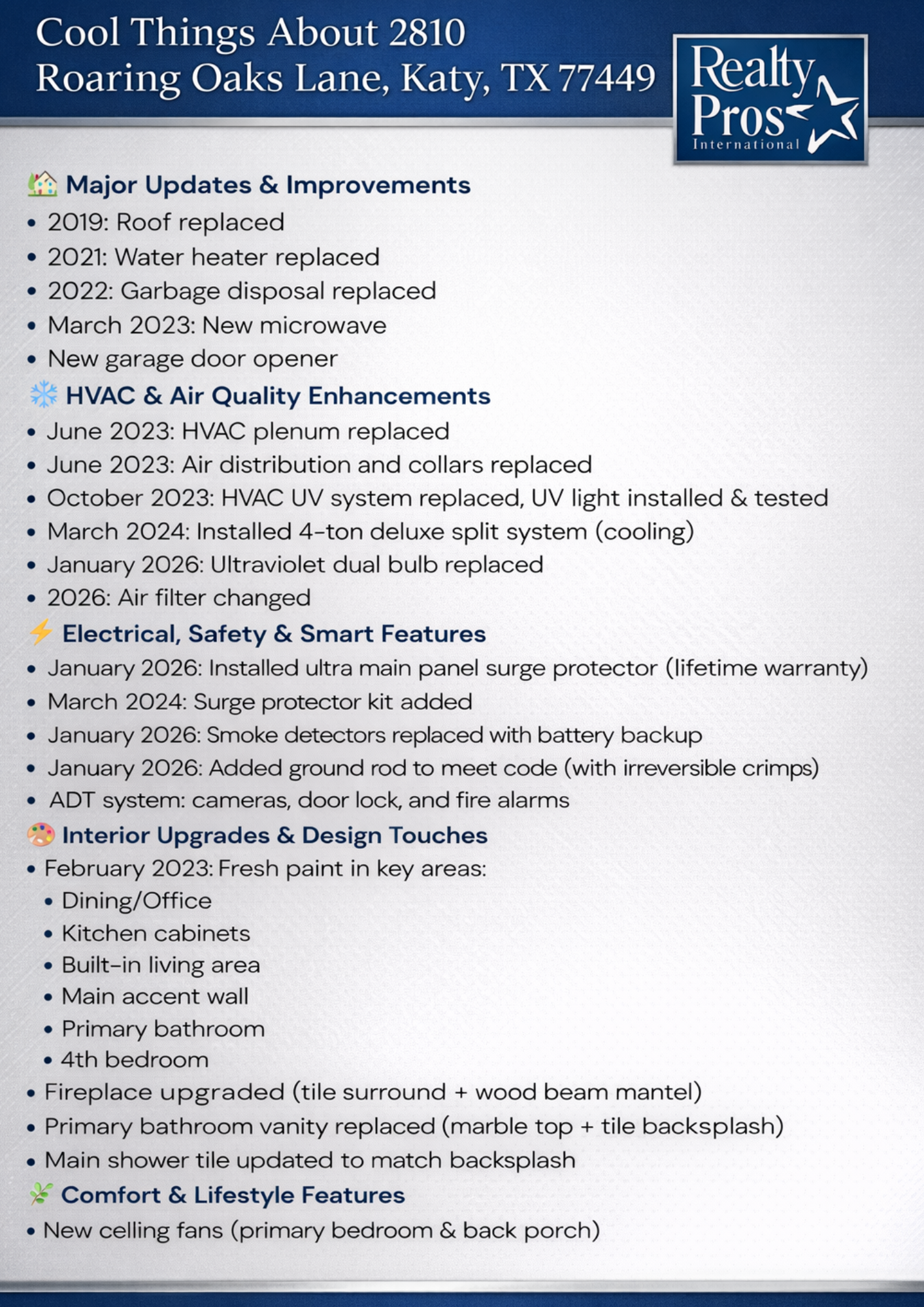 Beautifully maintained one-story home offering a flexible 3/4 bedroom layout in the sought-after Morton Ranch community. The open-concept kitchen features granite countertops and a stylish backsplash, flowing into a living room anchored by a cozy natural gas fireplace. The primary suite includes a walk-in closet and a versatile attached flex room, perfect as a 4th bedroom or private study. Step outside to a beautiful back patio with plenty of space for entertaining or relaxing in the fresh air. Recent high-value updates include a 4-ton deluxe cooling system (2024) with a UV purifier (2023), a 2021 water heater, a 2019 roof, and a main panel surge protector with a lifetime warranty (2026), plus many more. Enjoy neighborhood amenities including a community lake, scenic walking trails, and a pool. Zoned to top-rated Katy ISD schools and conveniently located near shopping and dining. This home is a perfect blend of comfort, versatility, and move-in-ready reliability.