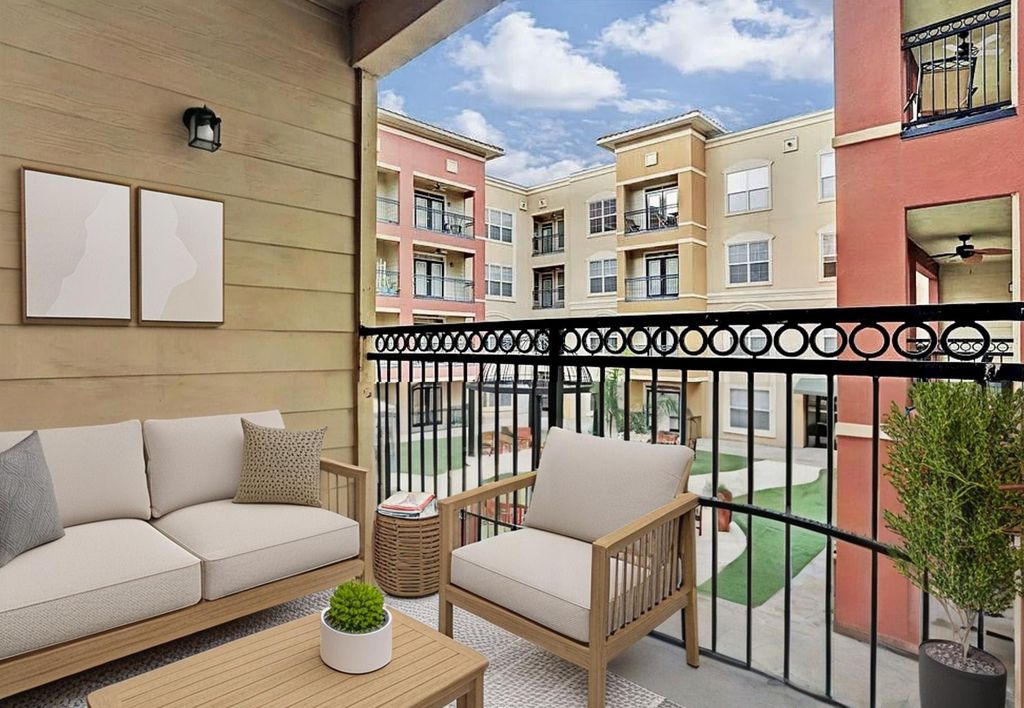 ONE OF THE LARGEST UNIT with tons of upgrades at The Valencia, featuring 24-hour security, a fully gated community, a resort-style pool, and a 24-hour fitness center with onsite management. This well-maintained two-bedroom condo offers spacious bedrooms on opposite corners with huge closets and en-suite baths. Step outside to your private covered balcony overlooking the tranquil courtyard to relax. This secure complex provides personalized app access and gated covered parking for convenience. Just minutes walk from the METRORail, perfect for those working or studying at the Texas Medical Center, Galleria, Downtown, University of Houston, St. Thomas, or Rice University. Located across the street from Texas Children's Hospital and just minutes from NRG Stadium. Washer, dryer, and refrigerator are included!