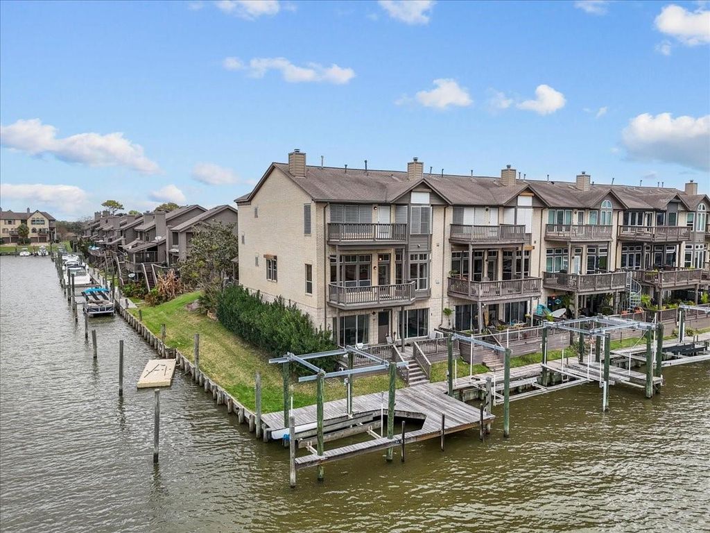 Experience elevated coastal living in this stunning three-story waterfront townhome on coveted Clear Lake. Perfectly positioned on a premium corner lot, this exceptional residence offers sweeping lake views, and the rare luxury of your own private boat slip — delivering seamless access to Clear Lake. Designed for both elegance and comfort, the open-concept floor plan showcases rich hardwood floors, expansive windows, and a striking stone fireplace that anchors the main living space. Bonus-home is adaptable for an elevator installation. Three oversized exterior balconies invite you to soak in panoramic water views, coastal breezes, and unforgettable sunsets from every level. The gourmet kitchen is a chef’s dream, beautifully appointed with a premium Thermador gas range, Sub-Zero refrigerator, custom cabinetry, and generous counter space ideal for entertaining. Your primary retreat feels like a sanctuary, vaulted ceilings, a private waterview balcony, and a spa-inspired en suite bath.