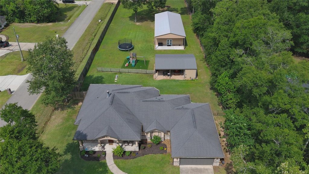 Move-in ready one-story home on a spacious 1.1-acre corner lot featuring two primary bedrooms. Enjoy a large dining room and an open family room with high coffered ceilings, cozy fireplace, custom built-ins, and recessed lighting. The kitchen is designed for both function and style with a large island and breakfast bar, custom cabinetry, under-cabinet lighting, stainless steel appliances, a huge walk-in pantry, and butler’s pantry. Plantation shutters throughout, plus upgrades like a whole-house dehumidifier, sprinkler system, Nest thermostat, and a mudroom with sink. The primary suite offers dual granite vanities, an oversized shower, jetted tub, and a large walk-in closet. A 3-car tandem garage with epoxy floors includes a rear door to the backyard. Out back, you’ll find an impressive 60x30 with 10' lean workshop with three roll-up bay doors—ideal for storage, hobbies, or business use.