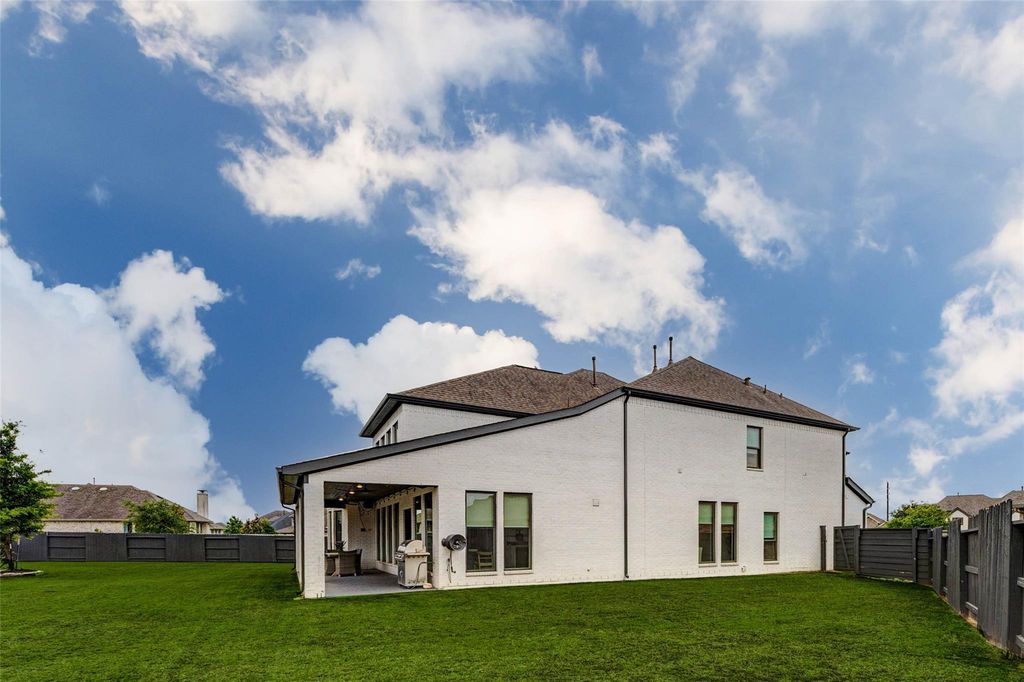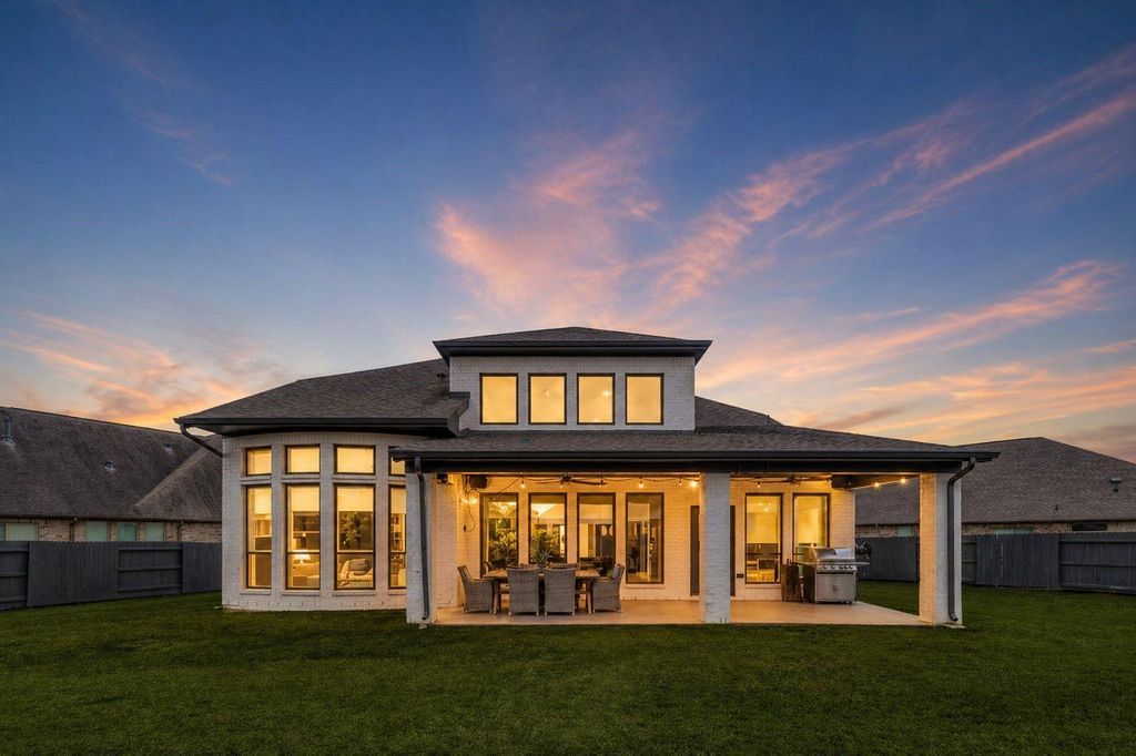Nestled on a quiet cul-de-sac in the prestigious Pomona community, this exceptional residence offers refined luxury and impeccable design. Featuring 4 bedrooms, 3 full baths, and 2 half baths, every detail has been thoughtfully curated. A distinguished private office with custom built-ins provides both elegance and function, while the paneled foyer leads to a sophisticated dining room filled with natural light and designer lighting. The gourmet kitchen is a true centerpiece, showcasing a dramatic waterfall island, breakfast bar seating, and seamless flow into the expansive living area—perfect for entertaining. Soaring ceilings, a statement fireplace, and walls of windows enhance the home’s airy ambiance. The primary suite is a serene retreat with a spa-inspired bath, while a secondary ensuite bedroom is conveniently located downstairs. Upstairs, enjoy a game room, media room, and additional bedrooms. Outdoors, a covered patio overlooks the spacious backyard, ideal for elevated living.