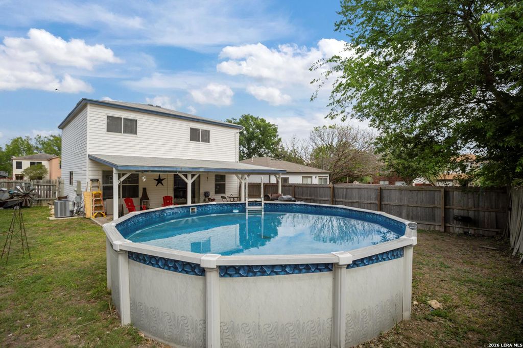 Welcome to this well-maintained 4-bedroom, 1.5-bath home in San Antonio offering a spacious and inviting layout. The large living room is filled with natural light and showcases beautiful wood flooring, creating a warm and open atmosphere perfect for both relaxing and entertaining. The kitchen features stainless steel appliances and flows seamlessly into the main living area, making everyday living and gatherings easy and convenient. A thoughtfully designed shelving area keeps the microwave neatly tucked away and out of sight, adding to the clean and functional kitchen layout. The primary suite is generously sized and includes a full bath, providing a comfortable private retreat. A large laundry room with a pantry combination adds extra functionality and storage space. Step outside to enjoy the covered patio with a 30 x 15 patio slab, offering an expanded outdoor living space ideal for dining, entertaining, or relaxing. An above-ground pool is ready for those hot Texas days, comp