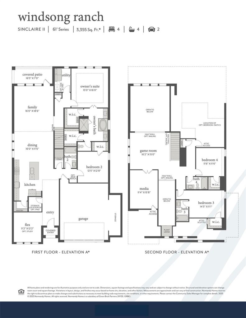 NORMANDY HOMES SINCLAIRE II floor plan. Welcome to this stunning 4-bedroom, 4.5-bath home that perfectly blends elegance and comfort. Step inside to soaring open-to-above ceilings in the family room, anchored by REVWOOD flooring that flows through all the common areas and beautiful wood stairs with open rail at the game room. The owner’s suite is a true retreat, featuring a spa-like bath, with a free-standing tub, large shower and soothing finishes that make relaxing simple. A second bedroom with a full bath is conveniently located downstairs, ideal for guests and two more bedrooms upstairs include individual baths so everyone has privacy. You will also treasure the dedicated spaces for work and play with a private study, media room, and game room. Thoughtful, custom finishes enhance every corner of the home, while the inviting patio extends your living space outdoors. With extra storage in the garage, this home is as functional as it is beautiful, plus it’s the last corner lot we offer in Windsong Ranch. Make it yours today!
