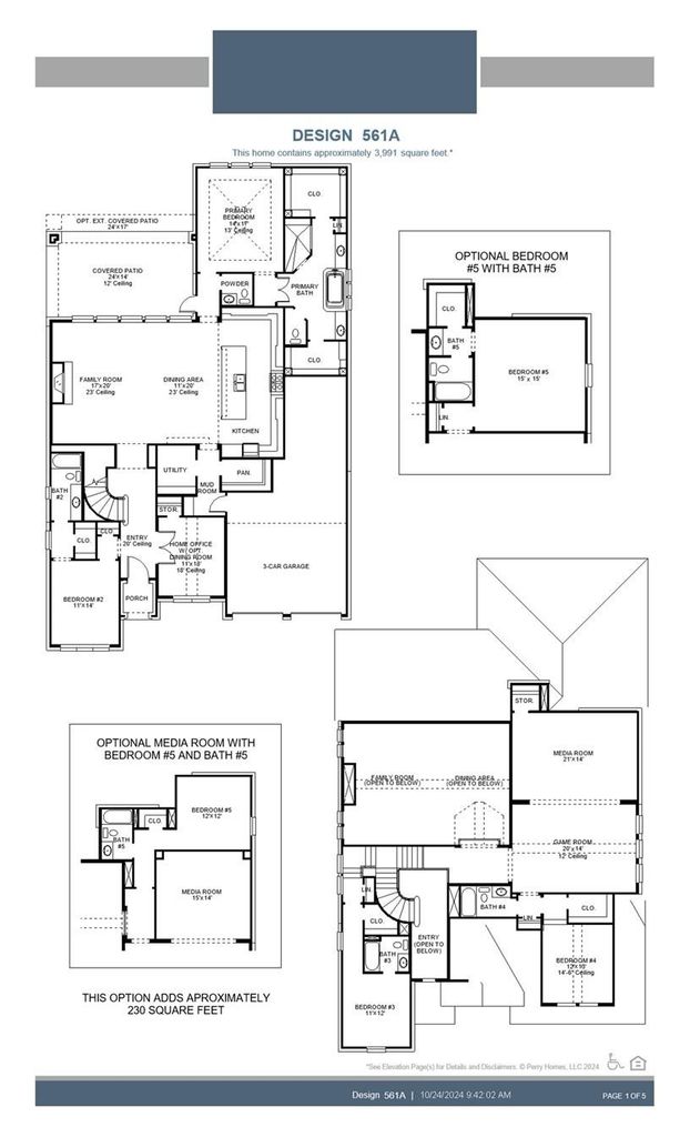 Two-story entry with 20-foot ceiling. Home office with French doors set at entry. Two-story family room and dining area with sliding glass doors. Kitchen has an island with built-in seating space and a spacious walk-in pantry. Primary suite with a wall of windows. Primary bath has a double door entry, dual vanities, a freestanding tub, a separate glass-enclosed shower and two walk-in closets. A guest suite with private bathroom just off the front entry. Second floor hosts a large game room, a media room with an additional storage space, and secondary bedrooms including a guest suite with a full bathroom and walk-in closet. Covered backyard patio. Three-car garage.