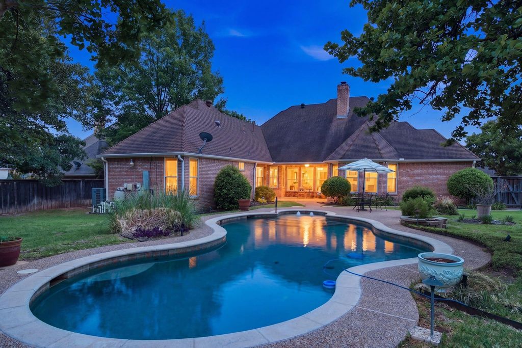 Prime location, generous lot, and single-story living in Colleyville. Located in highly acclaimed Grapevine-Colleyville ISD, near DFW airport, shopping, dining & entertainment. This rare opportunity features a spacious one-story home on a gorgeous half-acre lot with a pool—an increasingly hard find property. Ideally situated within walking distance to all three schools and two parks, with Glenhope Elementary just a block away. Perfectly positioned for easy access to Kimzey Park and the scenic trails leading to Parr Park, ideal for walking, running, or biking. The home offers strong bones and standout features, ready for your personal vision. From the moment you arrive, the circular drive and stately solid wood & leaded glass double doors set the tone. Inside, soaring ceilings elevate the formal living and dining areas, while a richly paneled study with custom built-ins creates the perfect work-from-home retreat. The main living space is designed for gathering and entertaining, featuring an open layout, multiple cozy gas log fireplaces, and a stylish bar complete with a Viking beverage fridge. The spacious kitchen offers a built-in Sub-Zero refrigerator, island and expansive black granite countertops—perfect for hosting or everyday living. The owner’s retreat is highlighted by a see-through gas fireplace that connects the bedroom to a spa-like bath, along with a custom-designed walk-in closet. The backyard is an oasis with shade trees and a lagoon style pool with a lounging deck and ample space for play, gardening, or creating an outdoor living area. Make this home your own. Priced to leave room for your personal updates, this home is the perfect canvas to bring your vision to life.