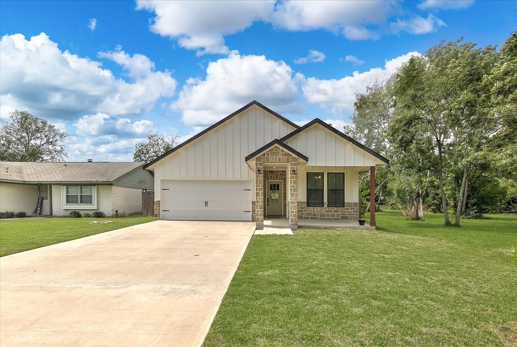Charming 3-bedroom home built in 2023 with abundant natural light and a modern farmhouse vibe. Features include a cute front porch, covered back patio, long driveway leading to a 2-car garage that boast an epoxied floor, and a fenced back yard. Inside, enjoy an electric fireplace with a shiplap accent wall, a pot filler over the stove, a spacious open floor plan with a large kitchen island, and generous bedrooms. Perfect for outdoor activities and relaxed living.