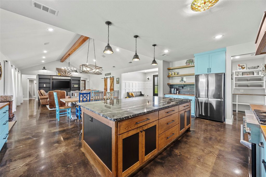 Experience the perfect blend of custom luxury and country charm in this stunning dream home. This beautifully designed 5-bedroom, 3.5-bath residence offers exceptional space, style, and thoughtful upgrades throughout. A versatile bonus room adds flexibility for a media space, game room, or home office. At the heart of the home, the expansive 9x5 granite island anchors a chef-inspired kitchen, complete with a coffee bar and pot filler—perfect for entertaining or everyday living. The fully custom interior showcases handcrafted vanities, rich wood beams, vaulted ceilings, and striking farmhouse chandeliers, creating a warm yet elevated aesthetic. The private primary suite is a true retreat, featuring a spa-like bathroom with a double walk-in shower, freestanding soaking tub, and dual custom vanities. A separate guest suite with its own full bath is thoughtfully positioned on the opposite side of the home for added privacy. Designed for convenience and efficiency, the home includes two laundry rooms, foam insulation, security lighting, and ceiling fans in every bedroom. Step outside from the primary suite through sliding glass doors to a spacious covered patio, ideal for relaxing or entertaining under the Texas sky. Situated with both well water and Poetry water, and featuring a poured shop slab ready for your future build, this property offers the perfect balance of functionality and lifestyle. This one truly has it all—custom design, modern comfort, and room to make it your own.