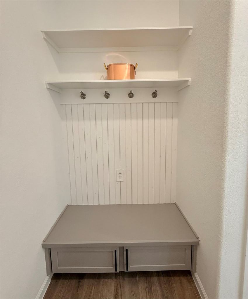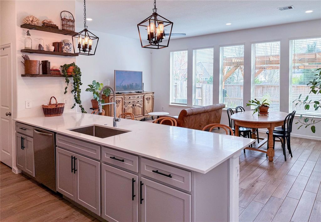 Beautifully upgraded and move-in ready, this bright home offers open-concept living with thoughtful upgrades throughout. The main living area is filled with natural light and flows seamlessly between the kitchen, dining, and living spaces. The kitchen offers quartz countertops, a gas range, abundant cabinetry, and a large peninsula with seating. Stylish tile upgrades and upgraded wood stairs add warmth and character throughout the home. Upstairs, the spacious primary suite includes a walk-in closet with added shelving and a private bath. Two secondary bedrooms share a convenient Jack-and-Jill bathroom. The powder bath features upgraded cabinetry topped with quartz. Step outside to enjoy the cedar pergola-covered patio, creating a great outdoor entertaining space. Additional highlights include a dedicated laundry room, mudroom drop zone with bench and storage, and added shelving throughout the home. Buyer to independently verify all room measurements.