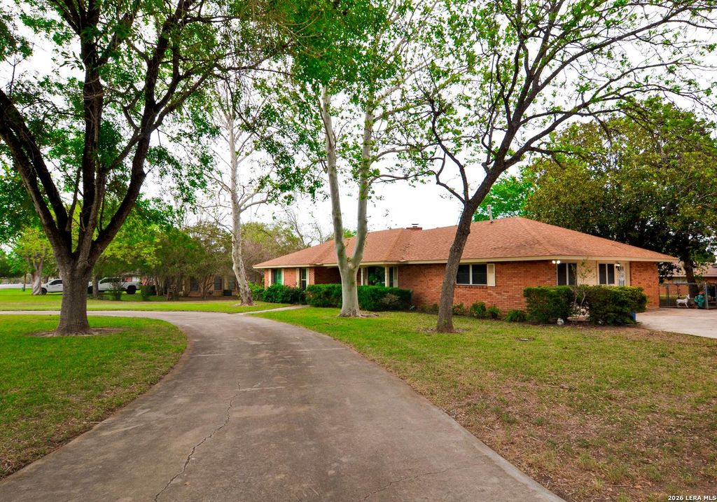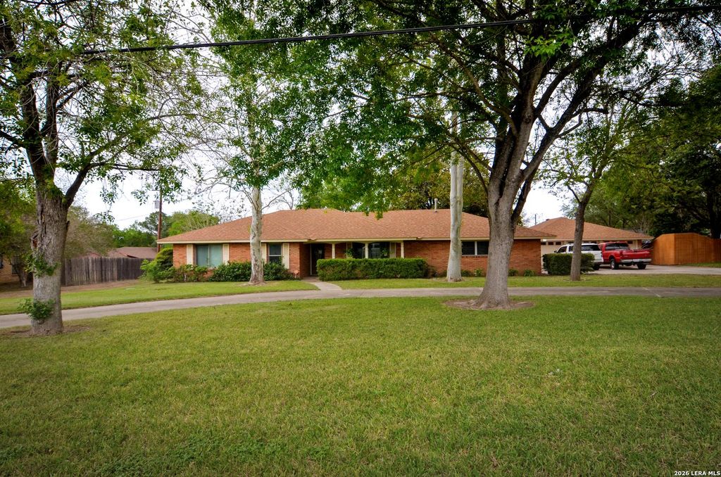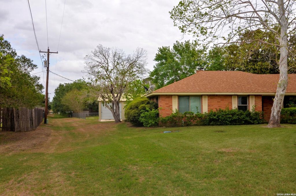 Floresville Estate with Guest House & Workshop. Versatility meets convenience on this lush 0.5-acre property. This expansive estate features a main residence, a fully independent guest apartment and 2 outer building for storage. Property also has two driveways the main one located on F Street with a separate one in the back off of Cottonwood. Main Residence (2,645 sqft): The primary home centers around a main living area off of the kitchen. Kitchen has a breakfast nook and eat-in bar. Flexibility is key: the oversized den includes dedicated office space, while the formal dining and sitting areas adapt to your lifestyle. The home features 3 bedrooms, 2.5 bathrooms, and abundant storage throughout. Practicality is built-in with a spacious laundry/mudroom and half bath located just off the back patio. Independent Guest Apartment (570 sqft): This self-contained 1-bedroom 1 bath unit includes a full kitchen, living area, laundry room, and 40ft covered porch with separate driveway