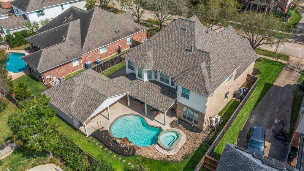 Westbrook Forest Retreat – Elegant Living in Greatwood. Stunning 5-bedroom Newmark home featuring a dramatic two-story grand entrance. Inside, the home includes formal living and dining areas plus a fabulous GREAT ROOM with soaring 2-story ceilings, fireplace, and built-ins. The spacious kitchen features a walk-in pantry, Silestone counters, built-in desk, and a bay-window breakfast area. First floor primary suite boasts a luxurious bath with a whirlpool tub and a walk-in closet with built-ins. PLUS another first floor bedroom with adjacent full bath! Upstairs you’ll find a game room and a guest/in-law suite with office, providing flexible living space for family or visitors. Enjoy a private backyard oasis with a pool, spa, waterfall and two covered patios ideal for relaxing or entertaining, plus grassy areas perfect for kids and pets. New roof and water heater installed in 2024. Insulated Low-E windows. Extended garage offers extra storage space. Call today to schedule a private tour.